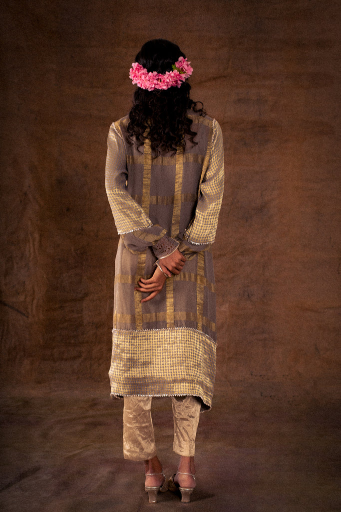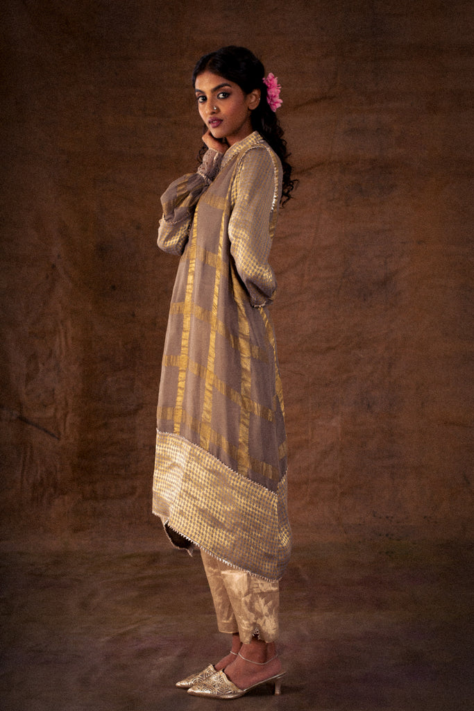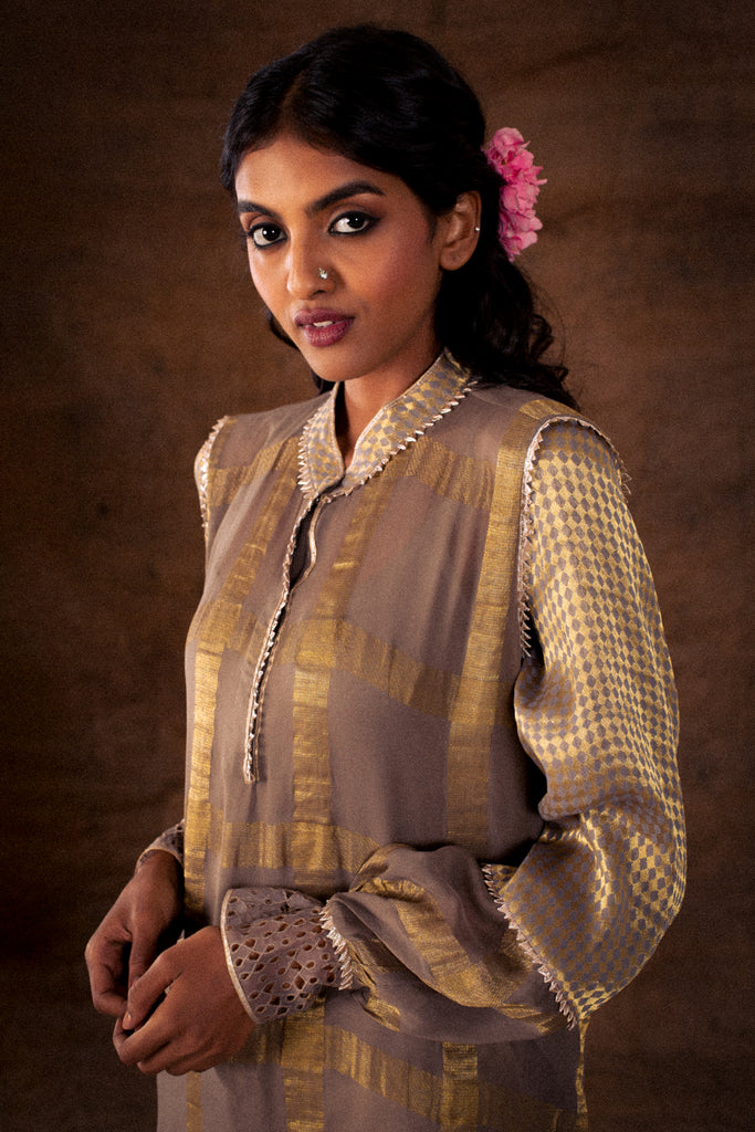 Want to say more with less? Nothing says effortlessly elegant as well as this woven georgette top in grey, detailed with intricate cutwork, big checks, and brocade sleeves.
