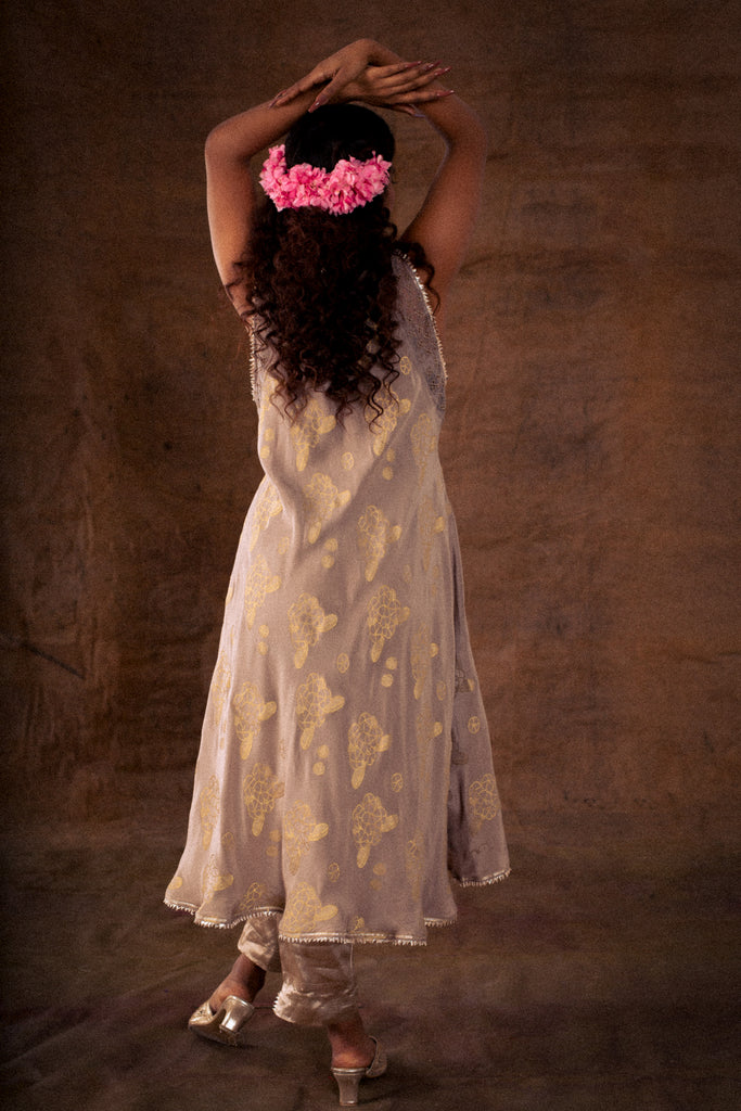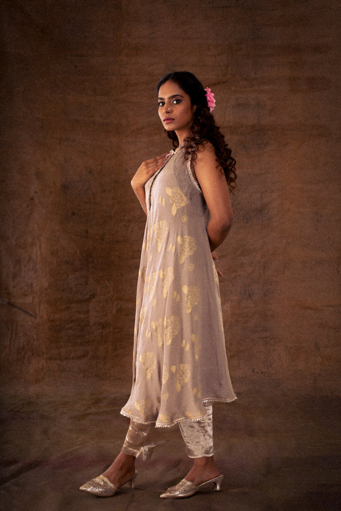 Be it a festival, a wedding, or any other occasion, this metalic grey crepe top with a woven cluster of flowers and cutwork will surely make a statement for you.
