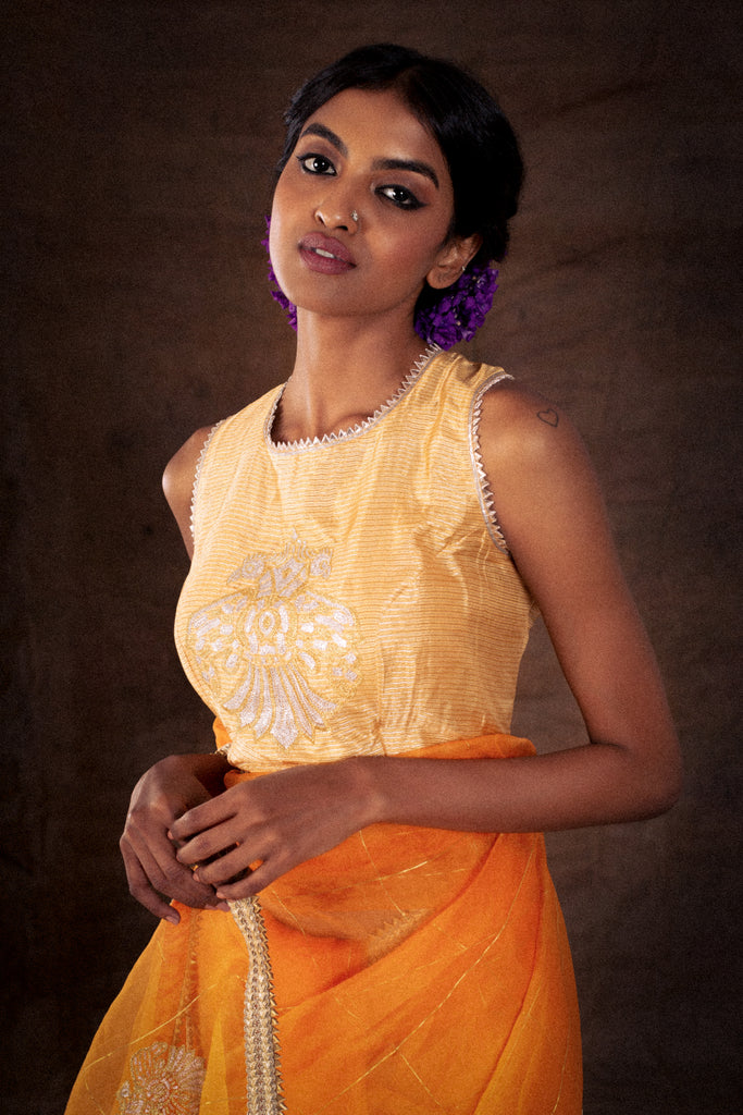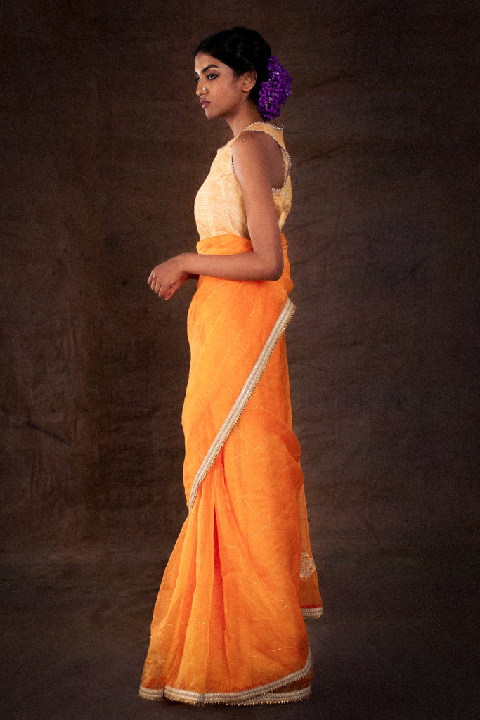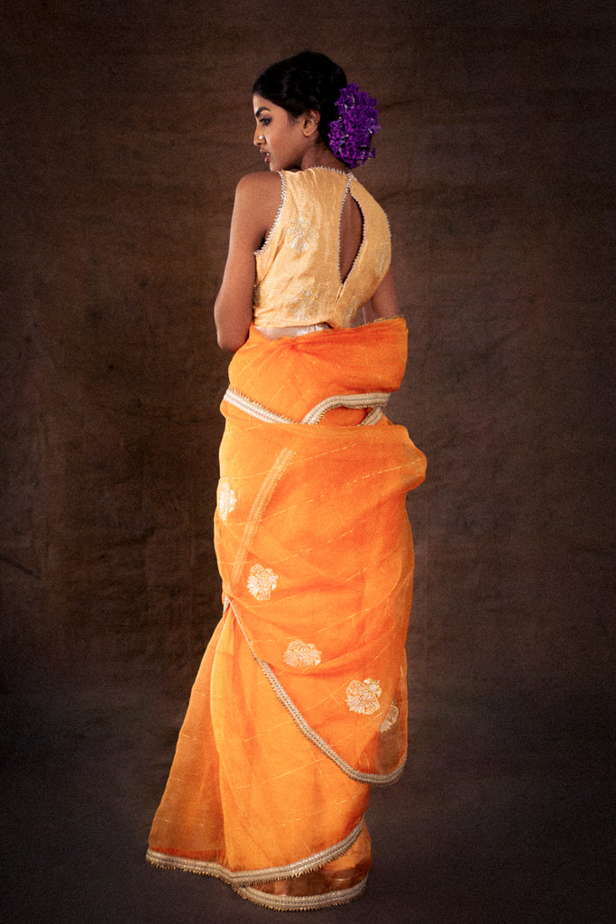Exude warmth and cheer wherever you go with this rich orange organza saree, paired with a gold and orange blouse and detailed wtih hand embroidery.