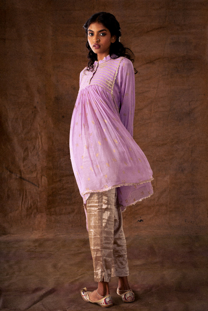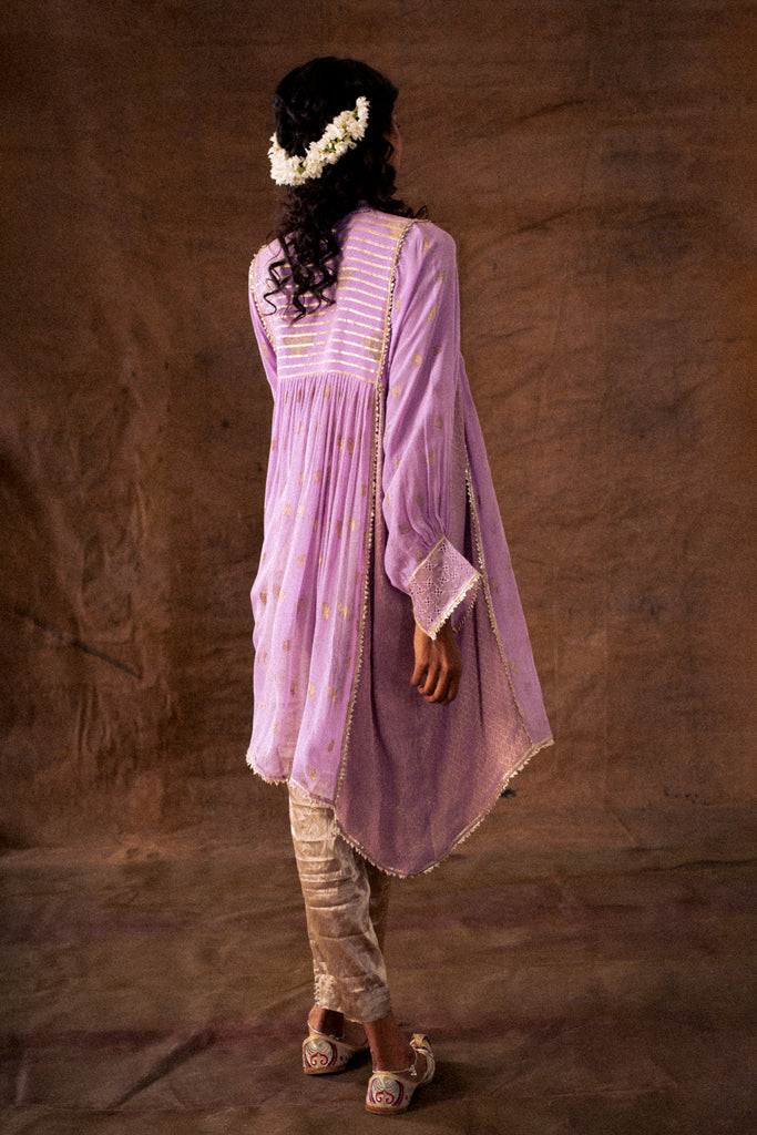 Want to say more with less? Nothing says effortlessly elegant as well as this rose woven with side brocade crepe top in purple, detailed with intricate cutwork sleeves.