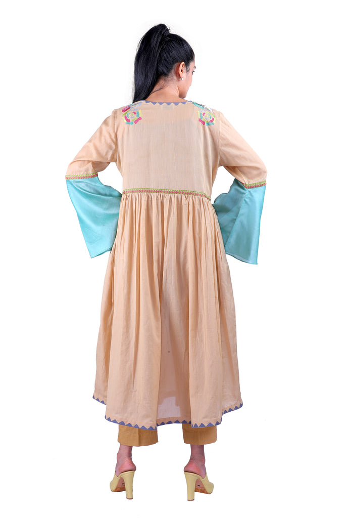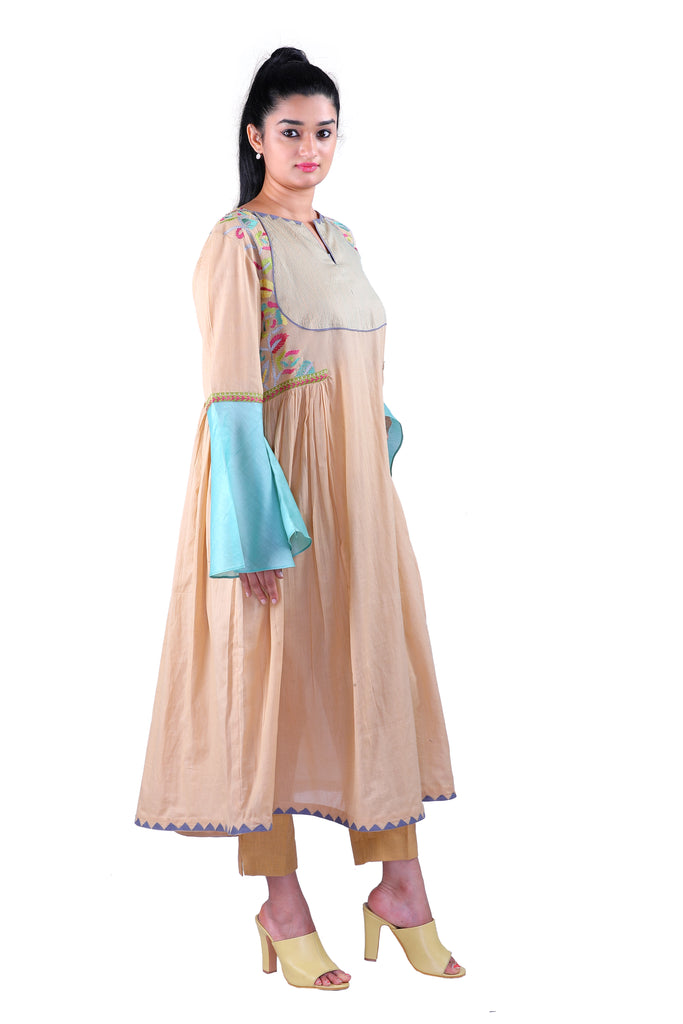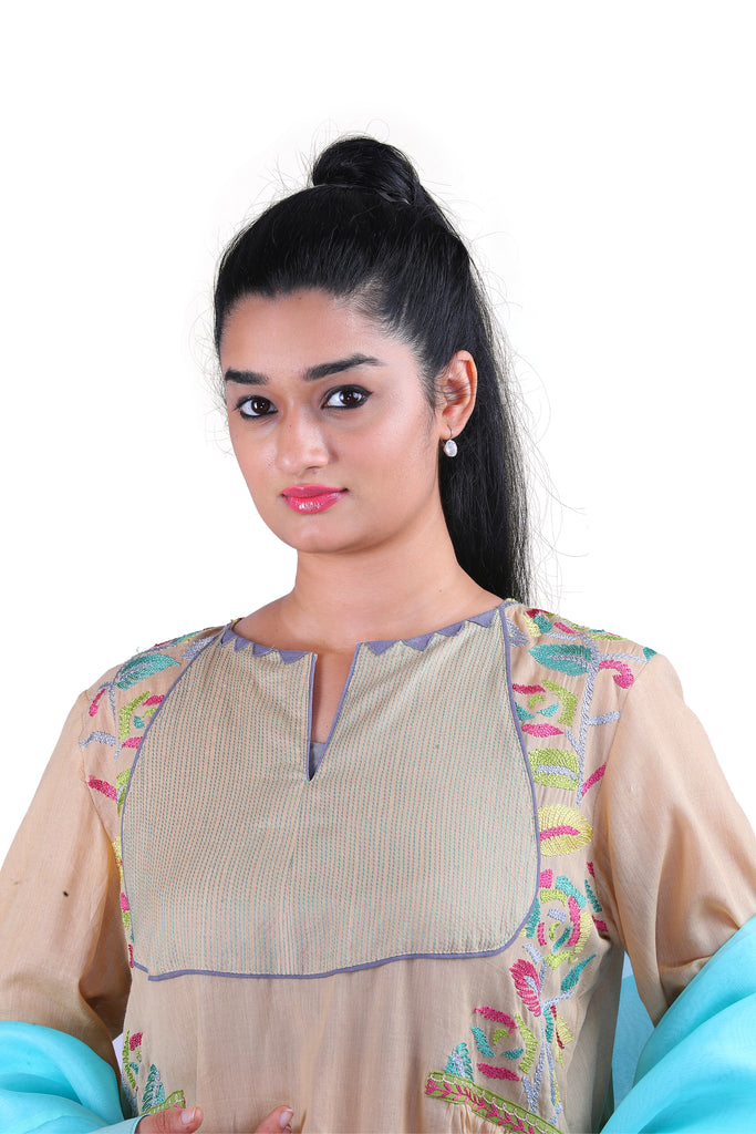 Say hello to a sunny spring with this lovely hand-woven Chanderi salwar in beige. Embellished with stunning multi-colored embroidery and threadwork, this kurta is best paired with a blue organza dupatta!