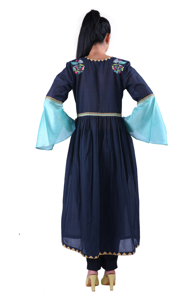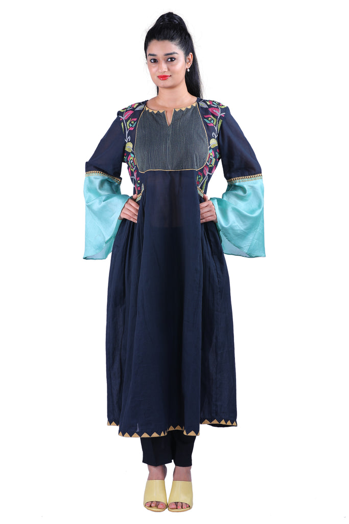 Say hello to a sunny spring with this lovely hand-woven Chanderi Salwar in black Embellished with stunning multi-colored embroidery and threadwork, this kurta is best paired with a blue organza dupatta!