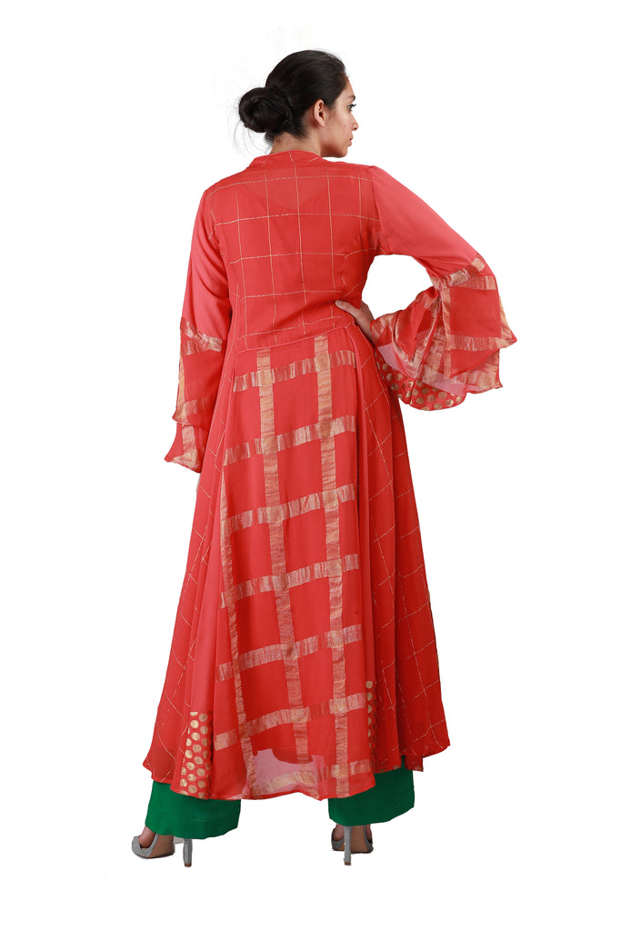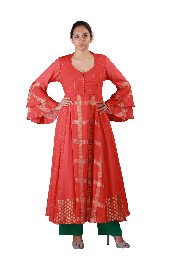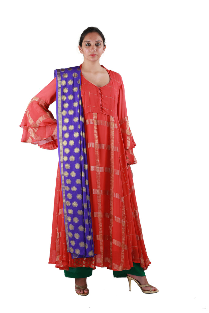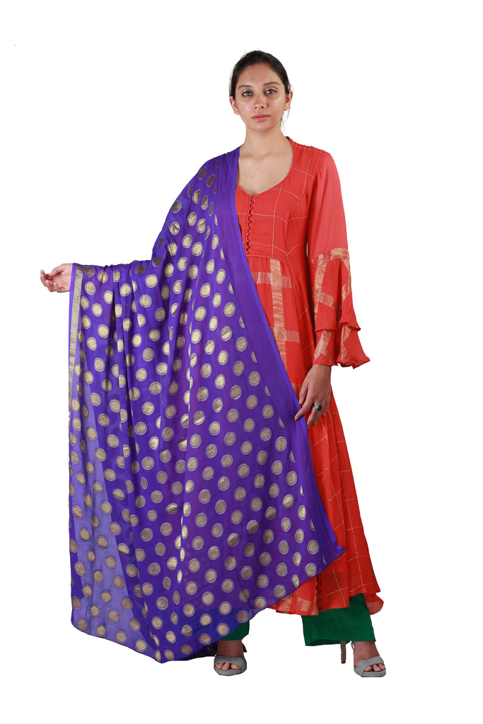 Make heads turn this festive season! Try this gorgeous georgette salwar in orange with bell sleeves, adorned with broad woven gold checks on the flare and thin checks on the yolk, paired with a contrasting purple georgette dupatta with gold polkas and green crepe pants.