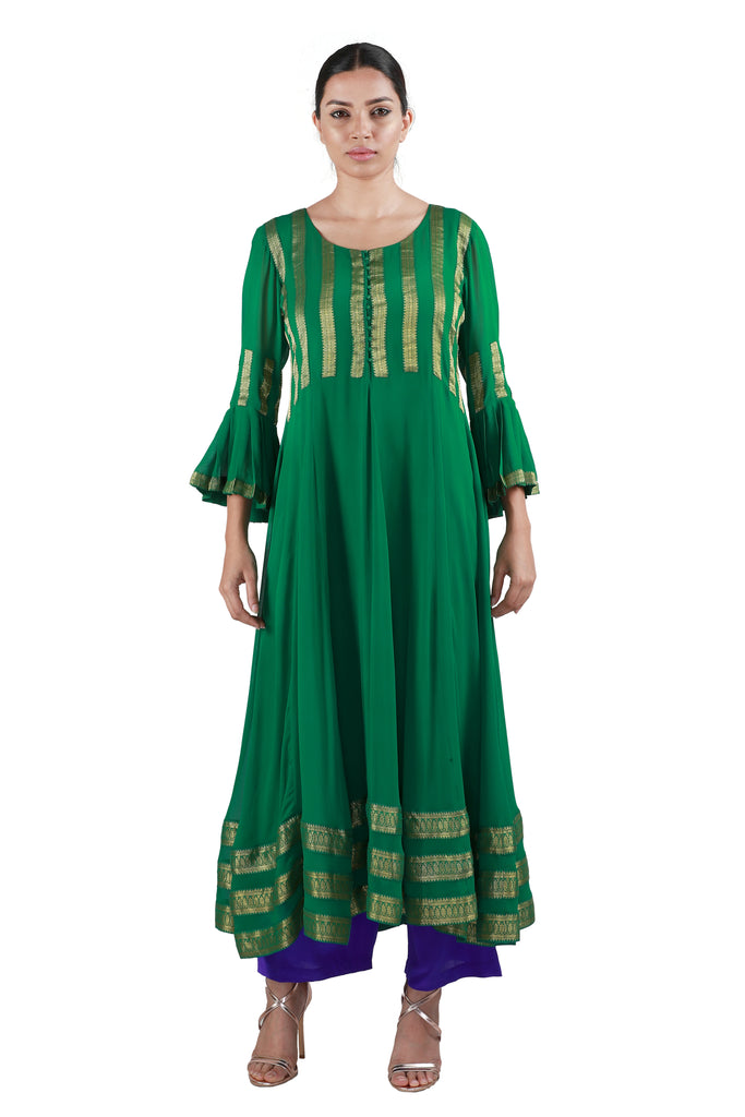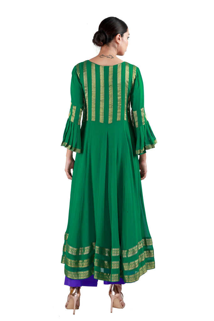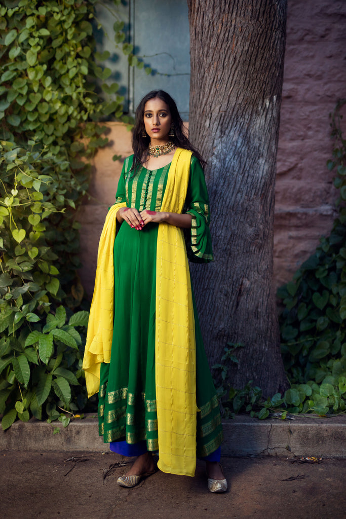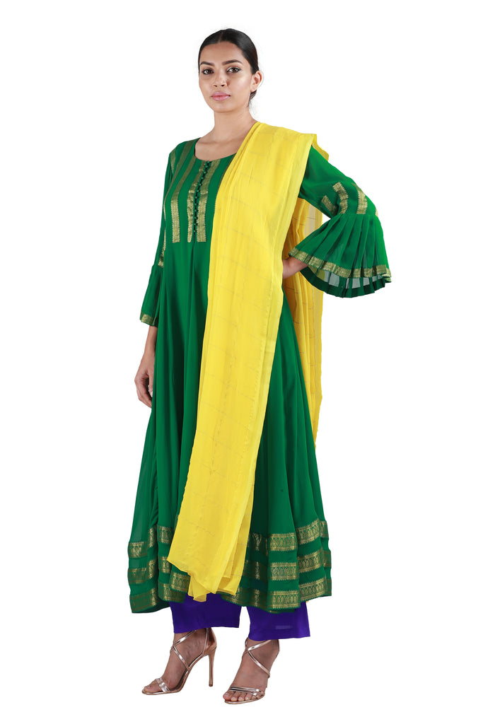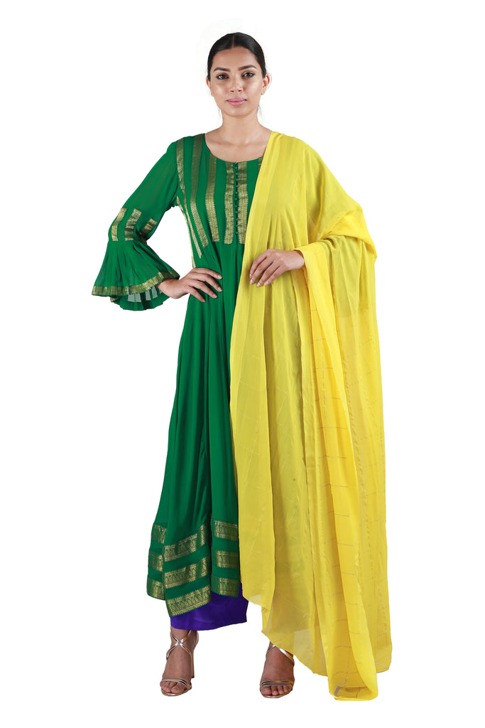 Embody the true spirit of the festive season with this stunning georgette salwar in green, embellished with woven gold borders, paired with a stunning yellow checkered dupatta in georgette and purple crepe pants.