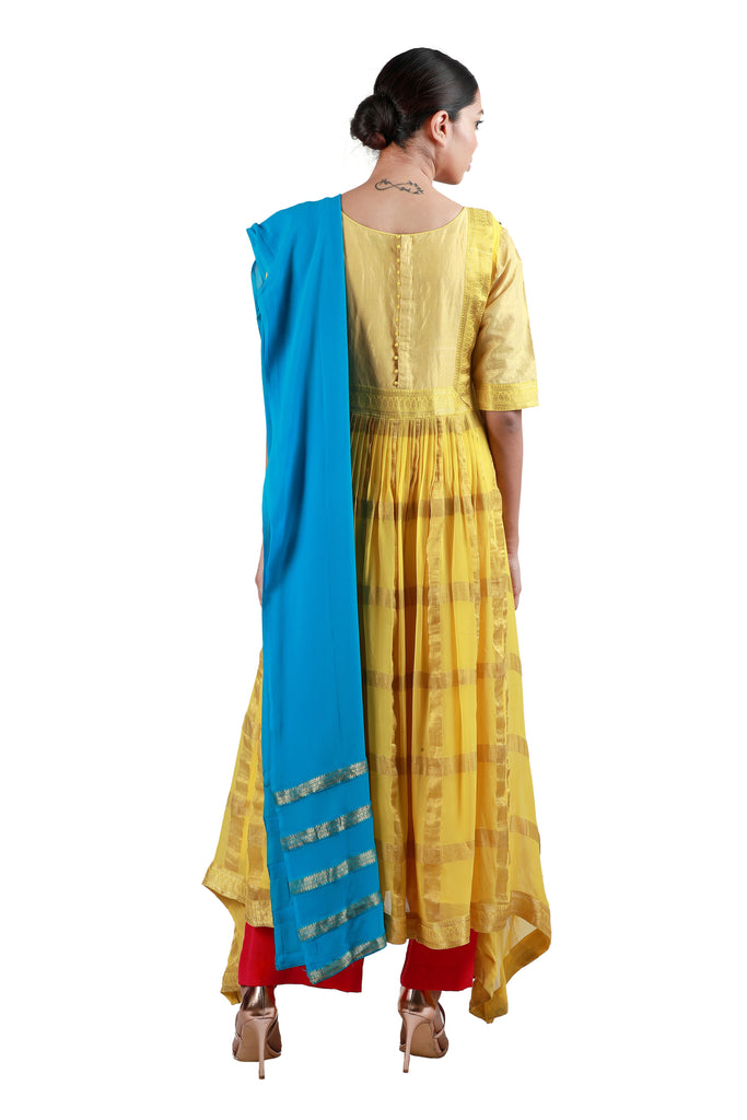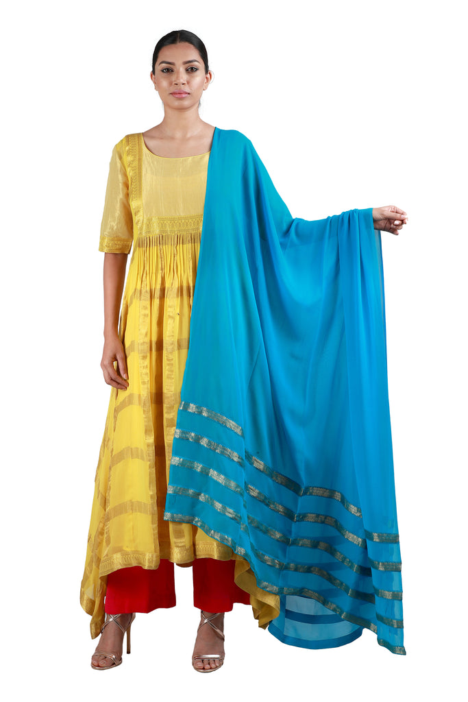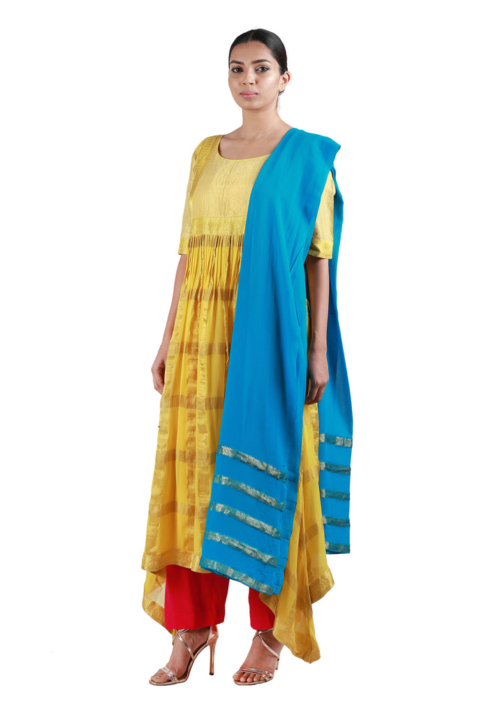 Embody the true spirit of the festive season with this stunning georgette salwar in yellow, embellished with broad woven gold checks, paired with a vivid blue georgette dupatta and orange crepe pants.