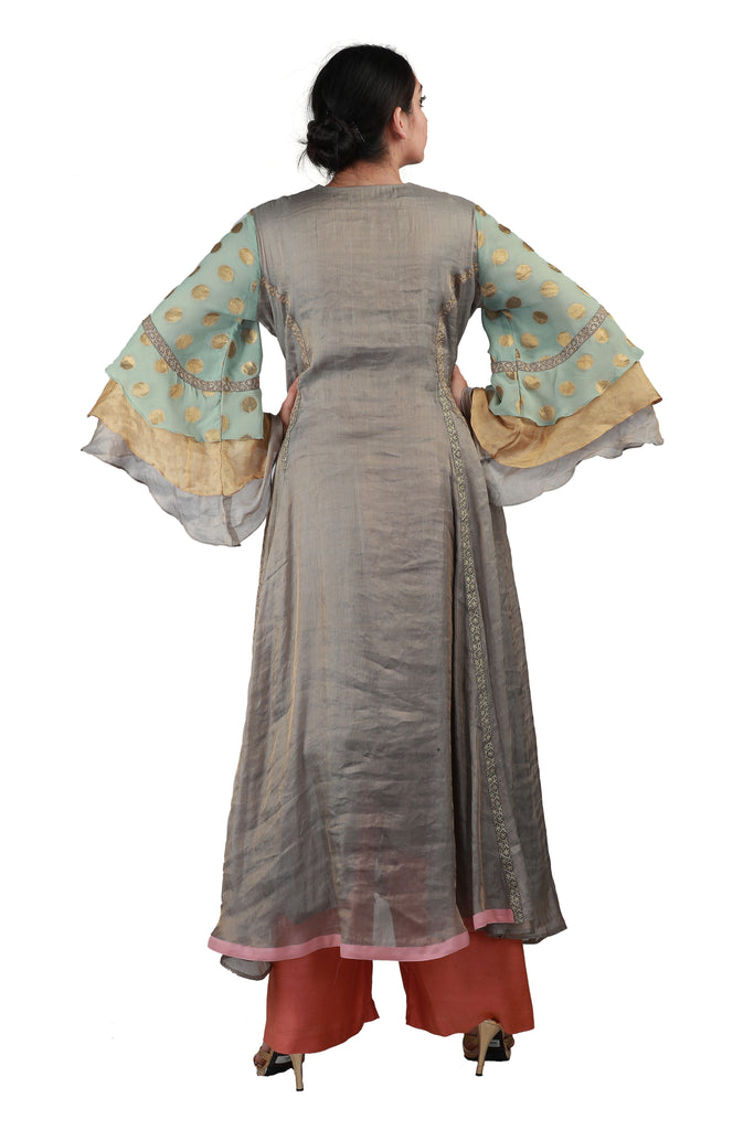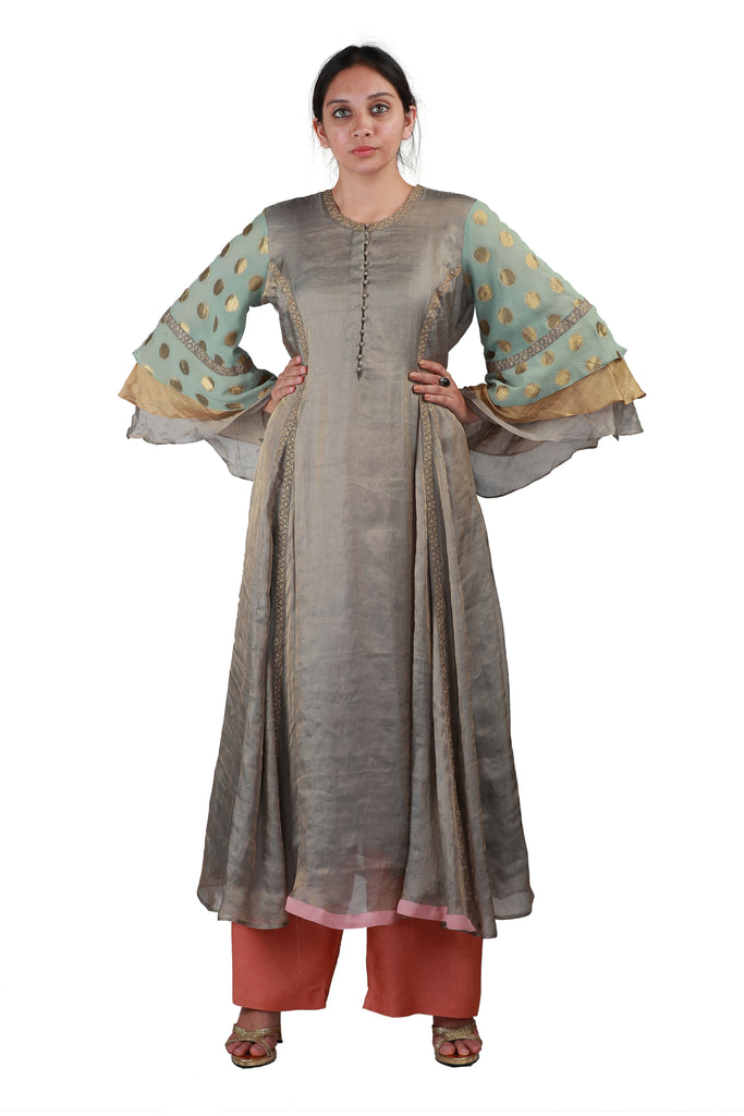 Excited to welcome the festive season? Let your unique sense of ethnic fashion shine with this luxurious tissue salwar in grey, embellished with woven gold polkas and embroidery on green bell sleeves, paired with a pink georgette dupatta with gold polkas and pink crepe pants.