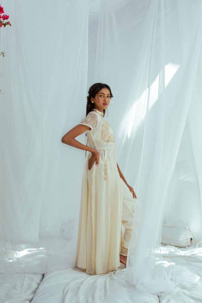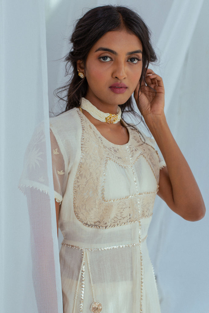 Be effortlessly elegant in this off-white cap sleeve long top, designed with premium hand-woven cotton and detailed with cream colored machine embroidery.