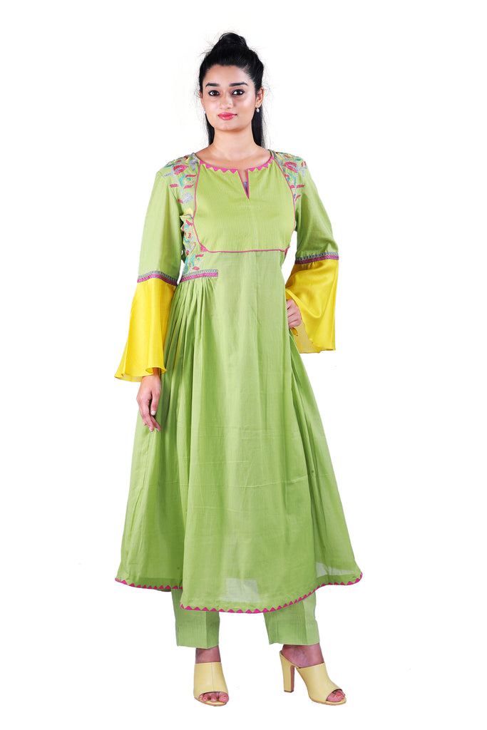 Say hello to a sunny spring with this lovely hand-woven Chanderi Salwar in lemon green Embellished with stunning multi-colored embroidery and threadwork, this kurta is paired with a yellow organza dupatta!