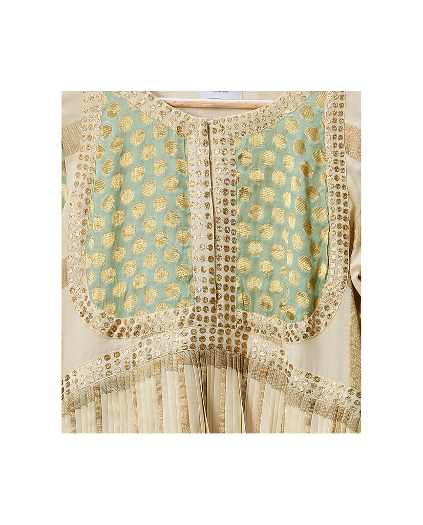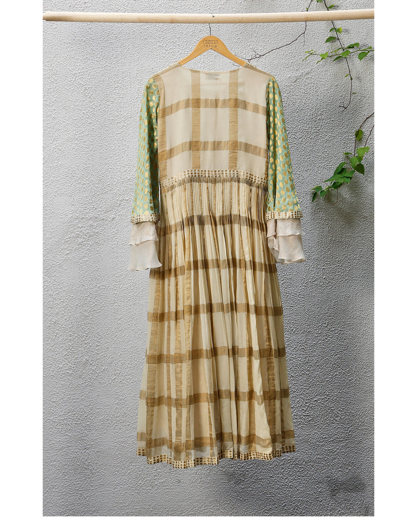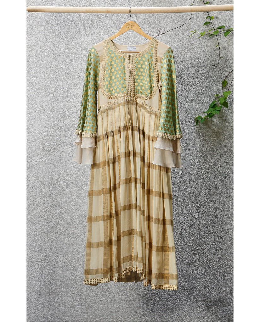 Salwar : Material - Silk georgette with Makana checks woven in gold jari, Colour - Off-white and teal, Embroidery - Silk thread and gold jari with Aari hand embroidery on yolk. Sleeves - Layered bell sleeves.