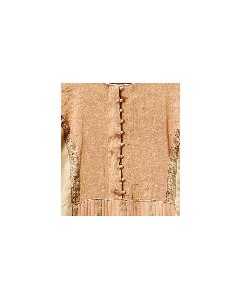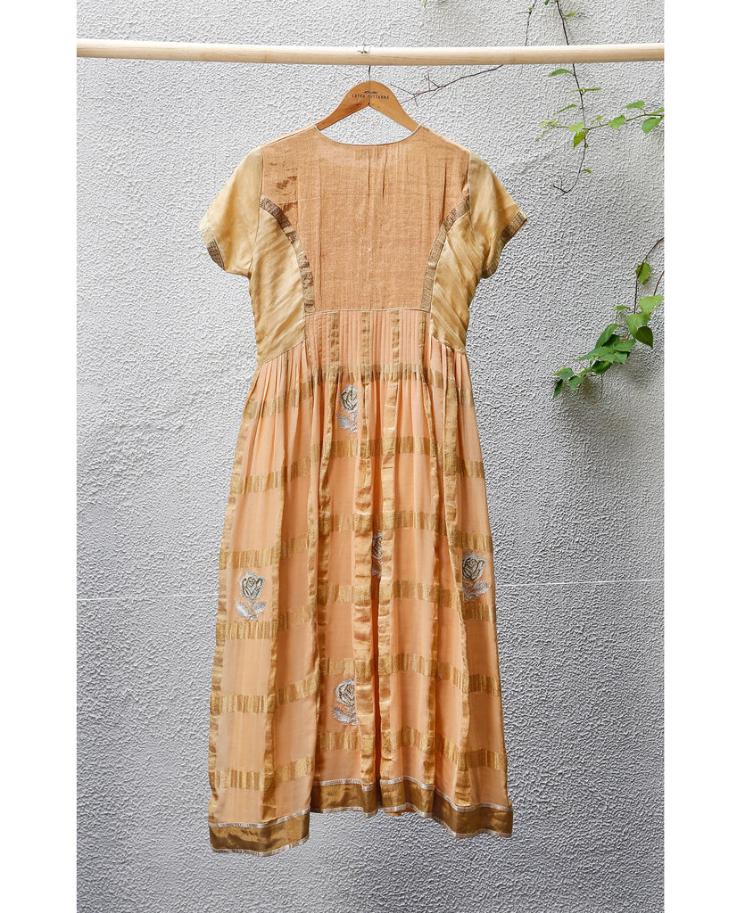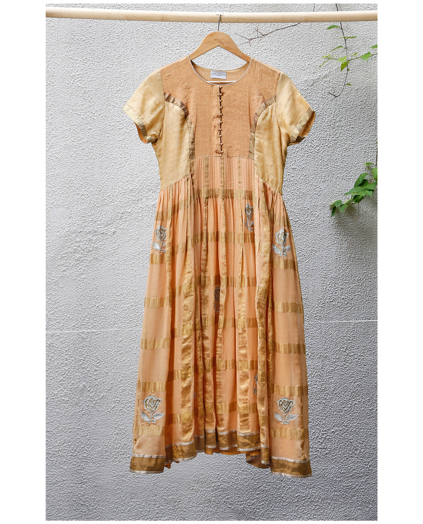 Salwar : Material - Silk georgette with Makana checks woven in gold jari, Colour - Peach, Embroidery - Silver and gold jari in roses with Aari hand embroidery, Sleeves - Cap sleeves.