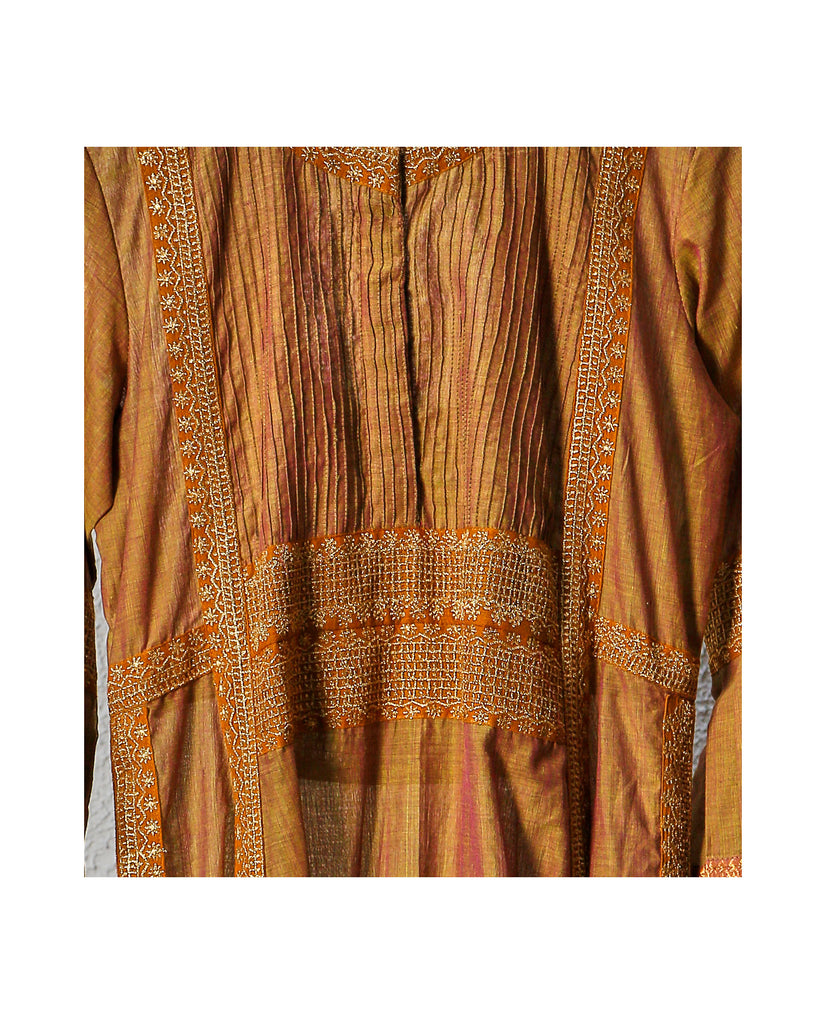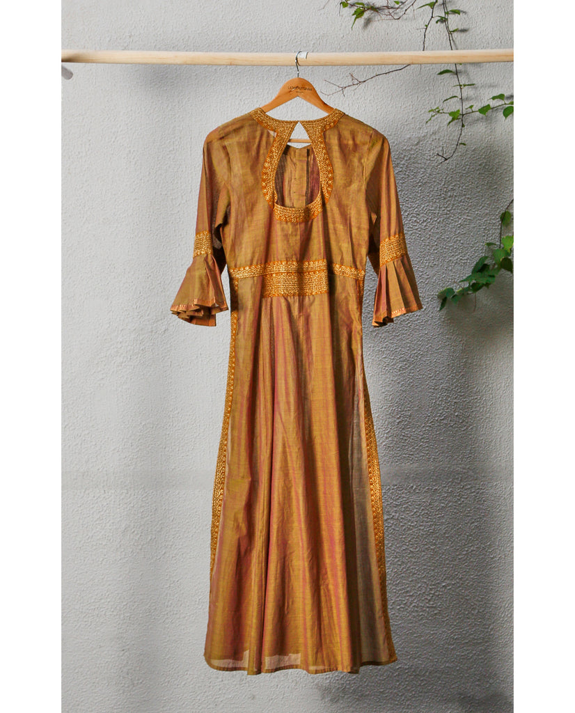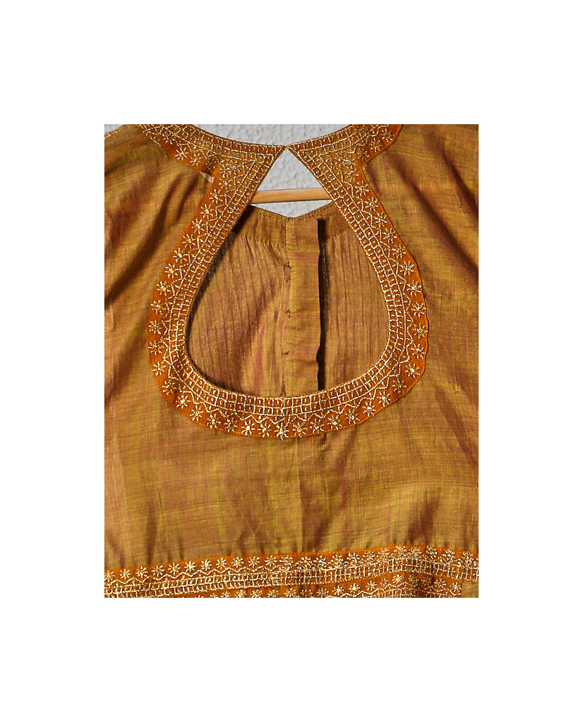 Salwar : Material - Handwoven Mangalgiri cotton, Colour - Brown, Sleeves - 3/4 sleeves with folded frill edging, Embroidery - Gold jari embroidery.