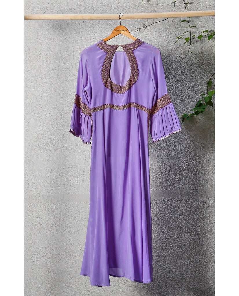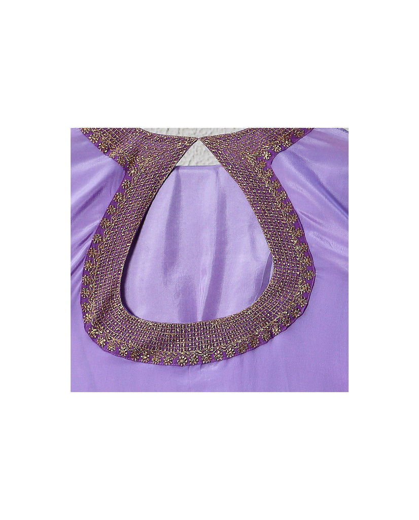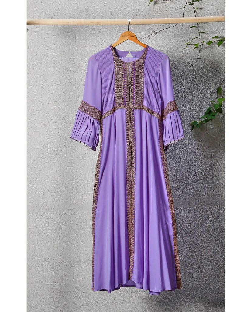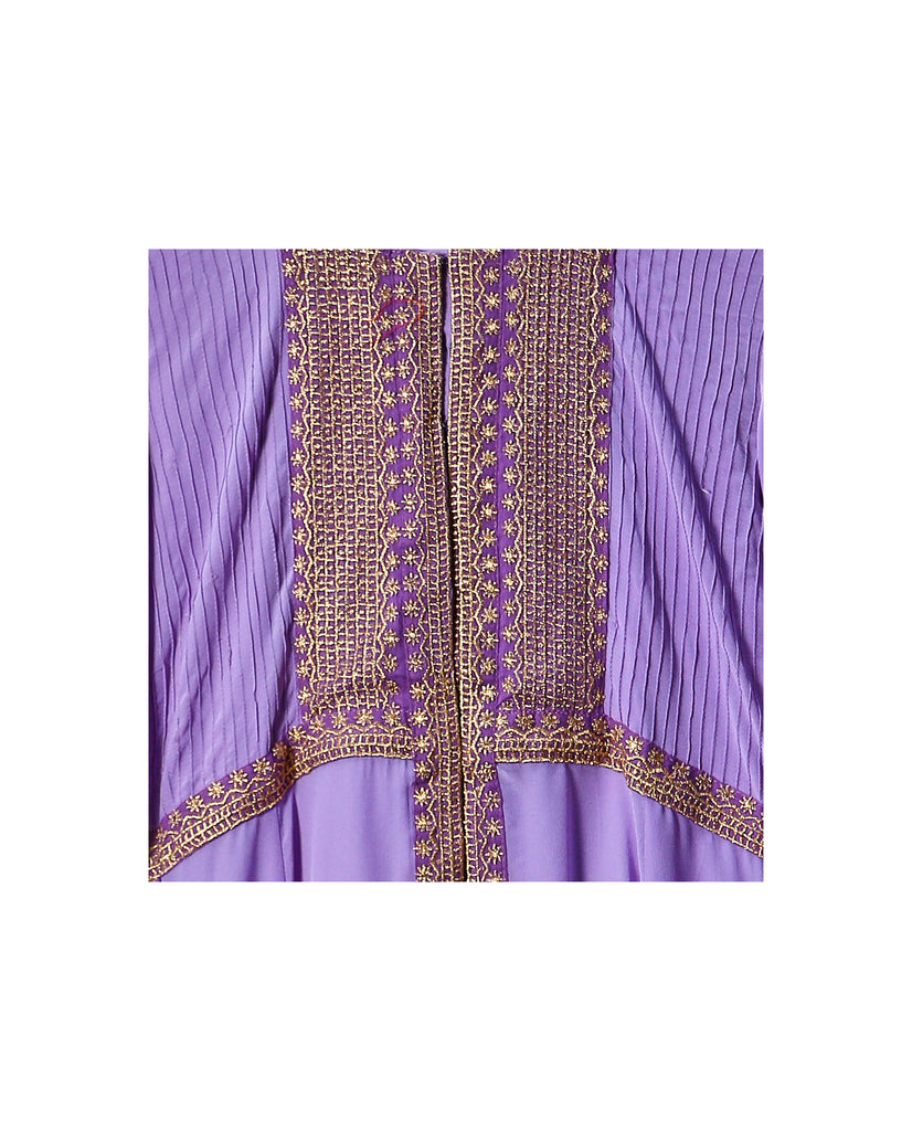 Salwar : Material - Crepe silk, Colour - Lavender, Sleeves - 3/4 sleeves with folded frill edging, Embroidery - Gold jari embroidery.