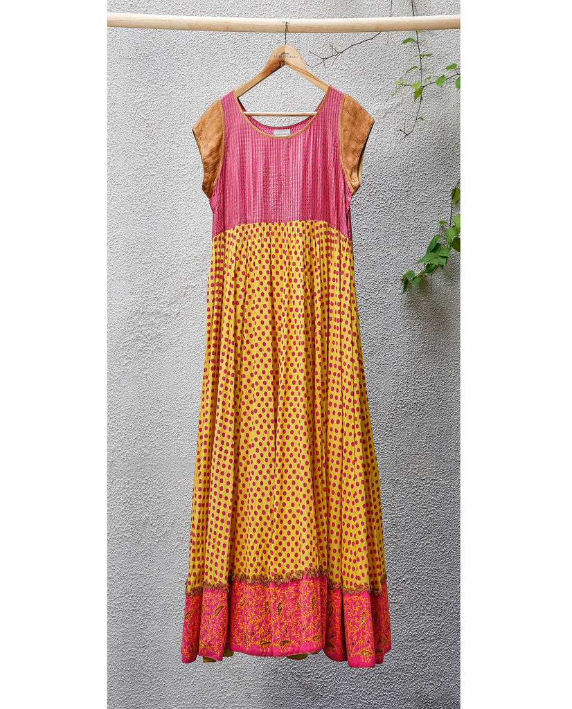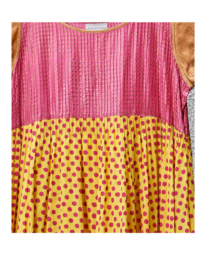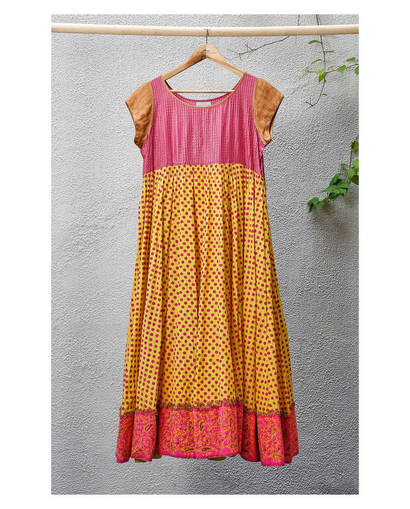 Salwar : Material - Silk, Colour - Yellow and pink, Sleeves - Cap sleeves, Craft - hand block print in polkas.