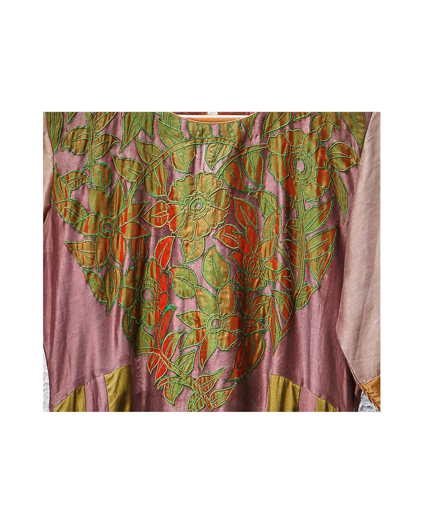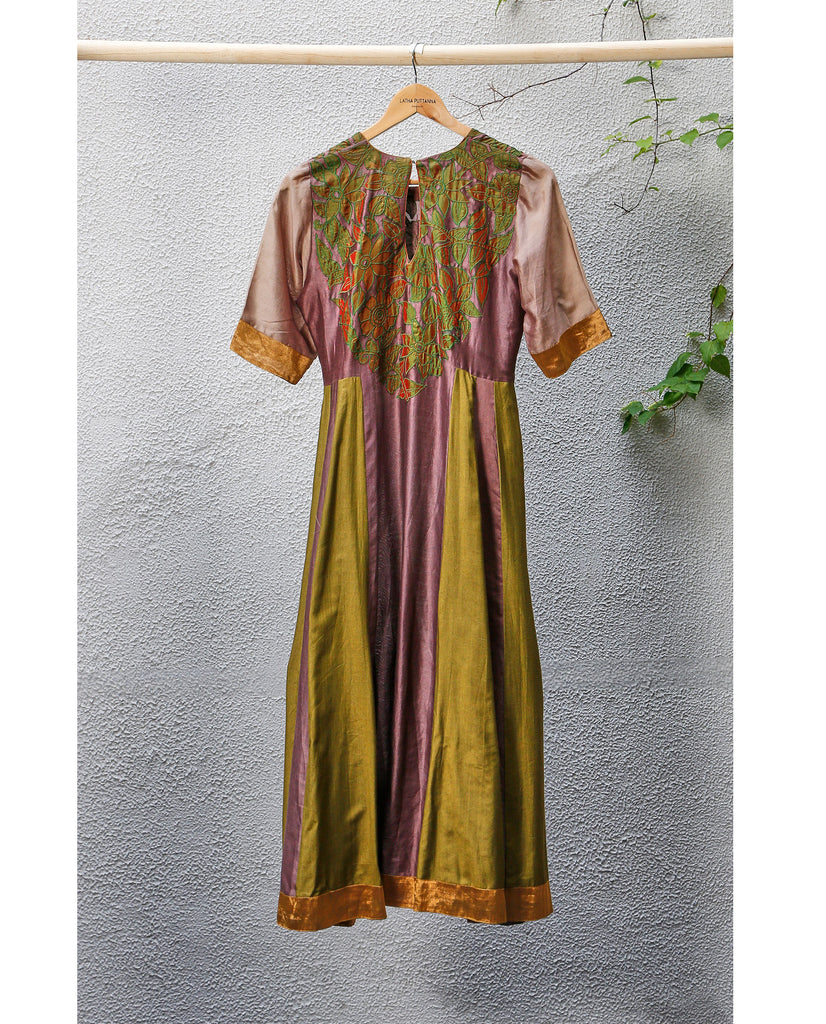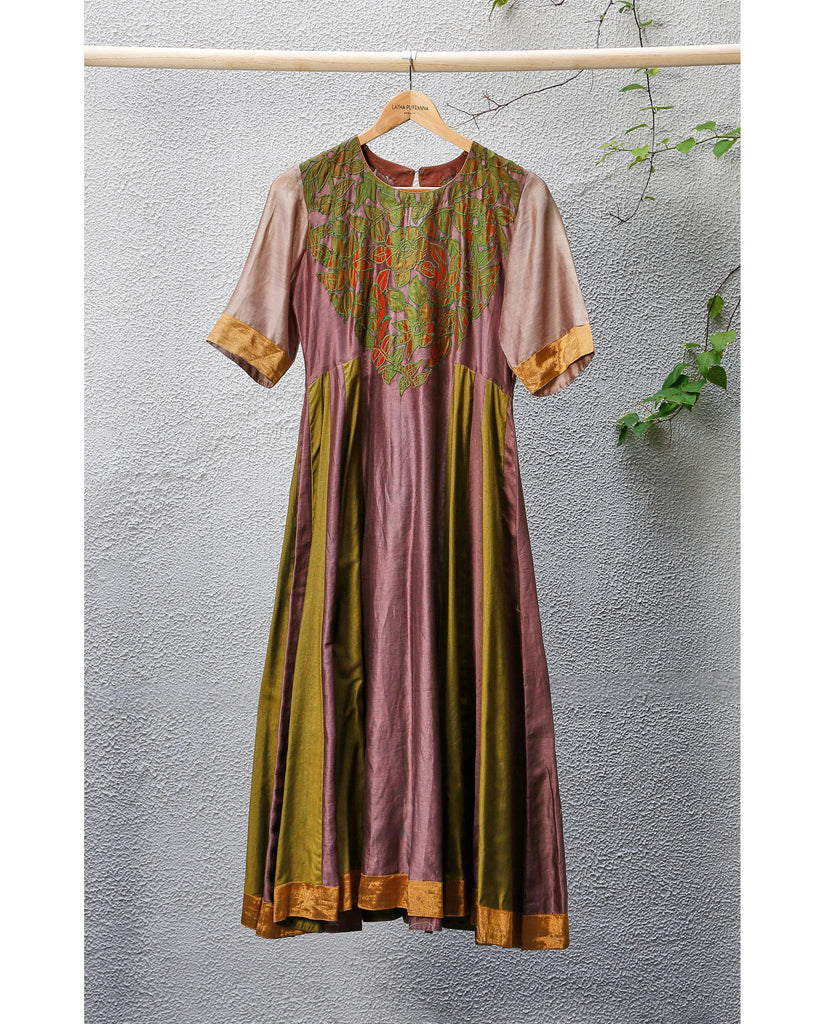 Salwar : Material - Chanderi silk, Colour - Grey and green, Sleeves - Short sleeves, Embroidery - Silk applique on yolk.