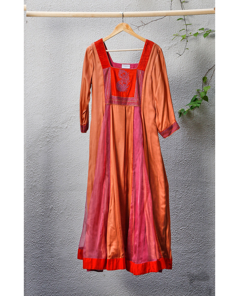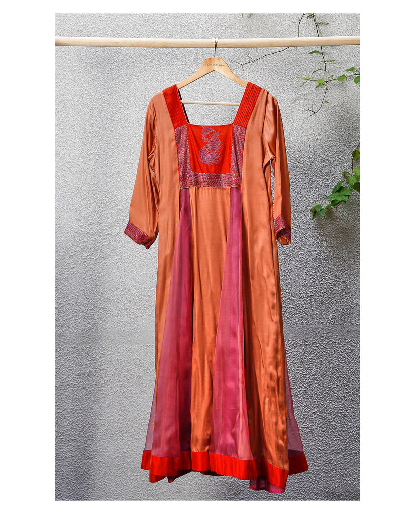 Salwar : Material - Tussar and organza, Colour - Brown and pink, Sleeves - half sleeve, Embroidery - Silk thread and gold jari Aari hand embroidery.