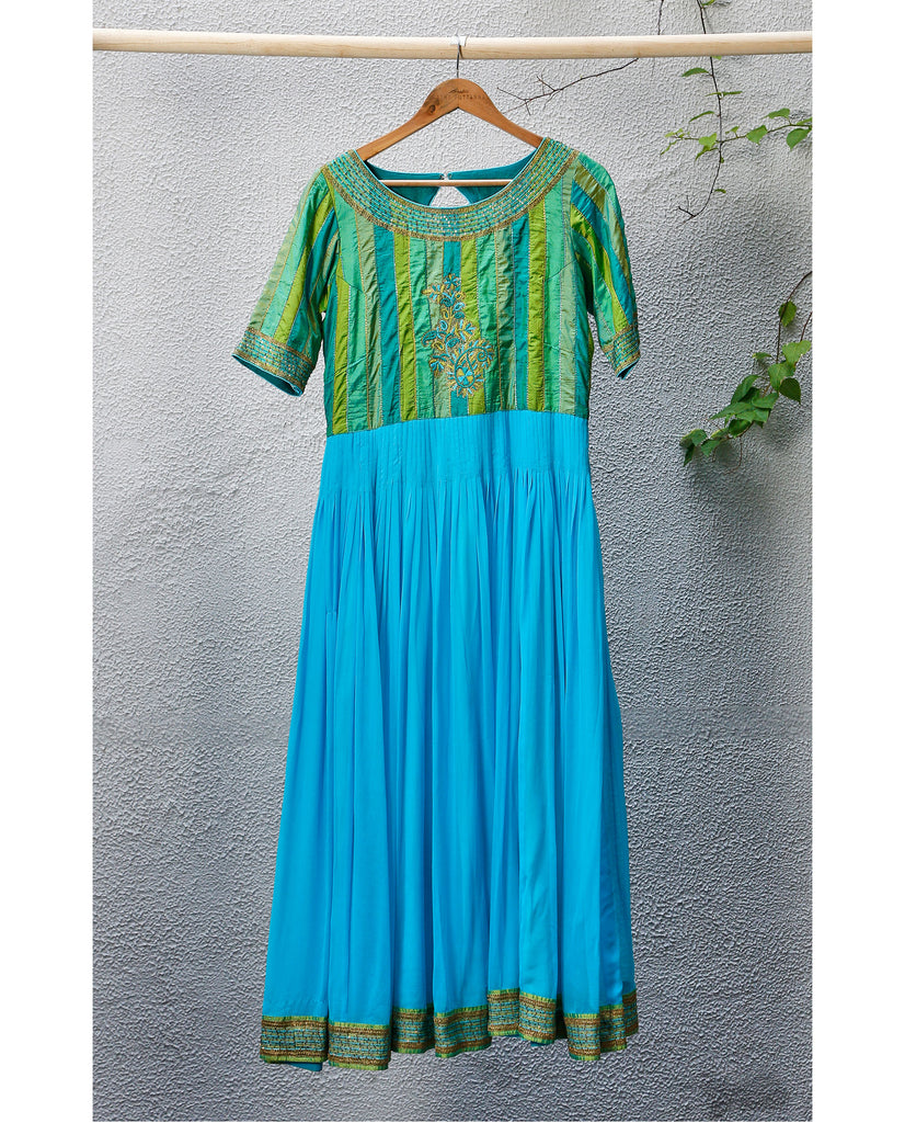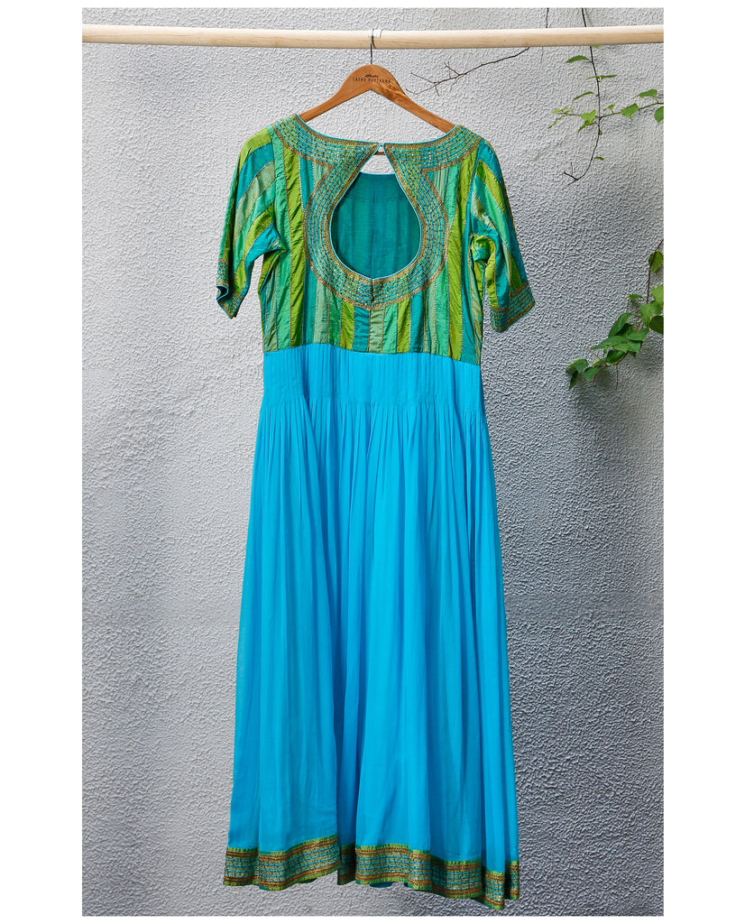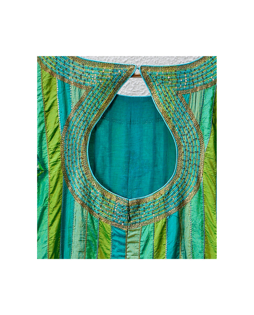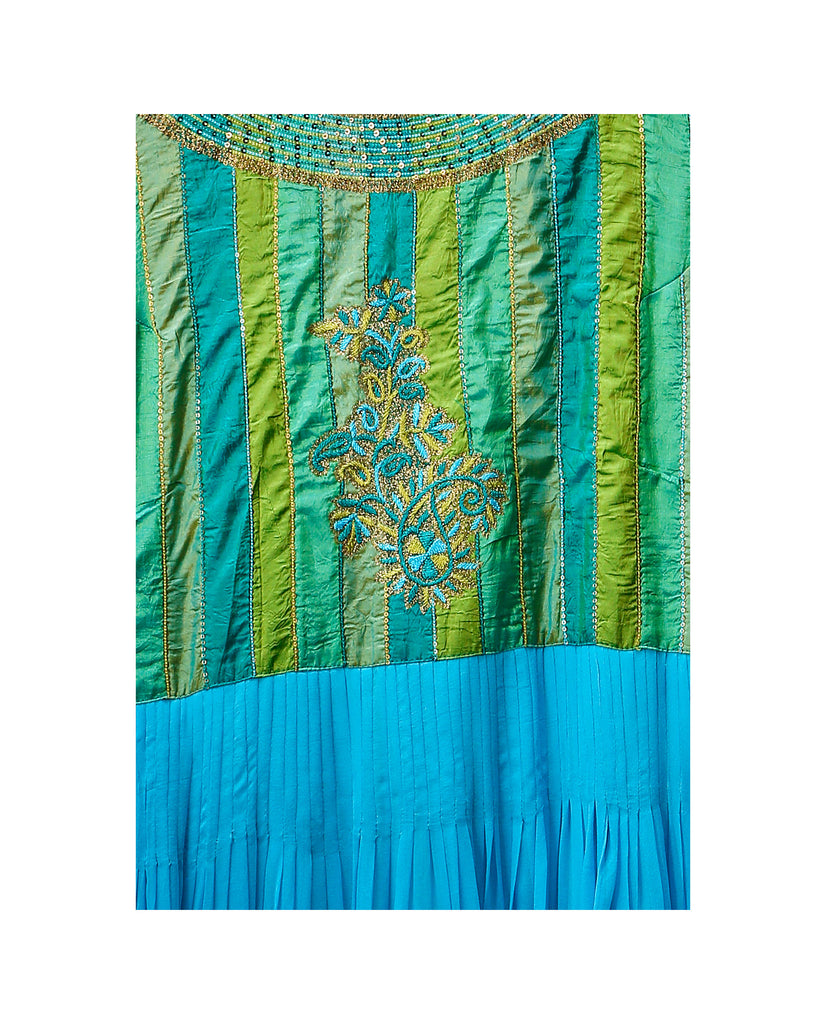 Salwar : Material - Silk georgette and Karnataka silk, Colour - Blue and green, Embroidery - Silk thread, sequence and gold jari with Aari hand embroidery, Sleeves - Half sleeves.