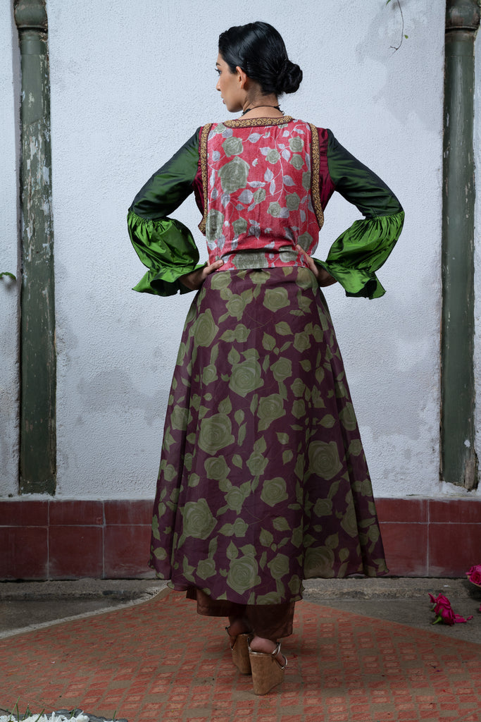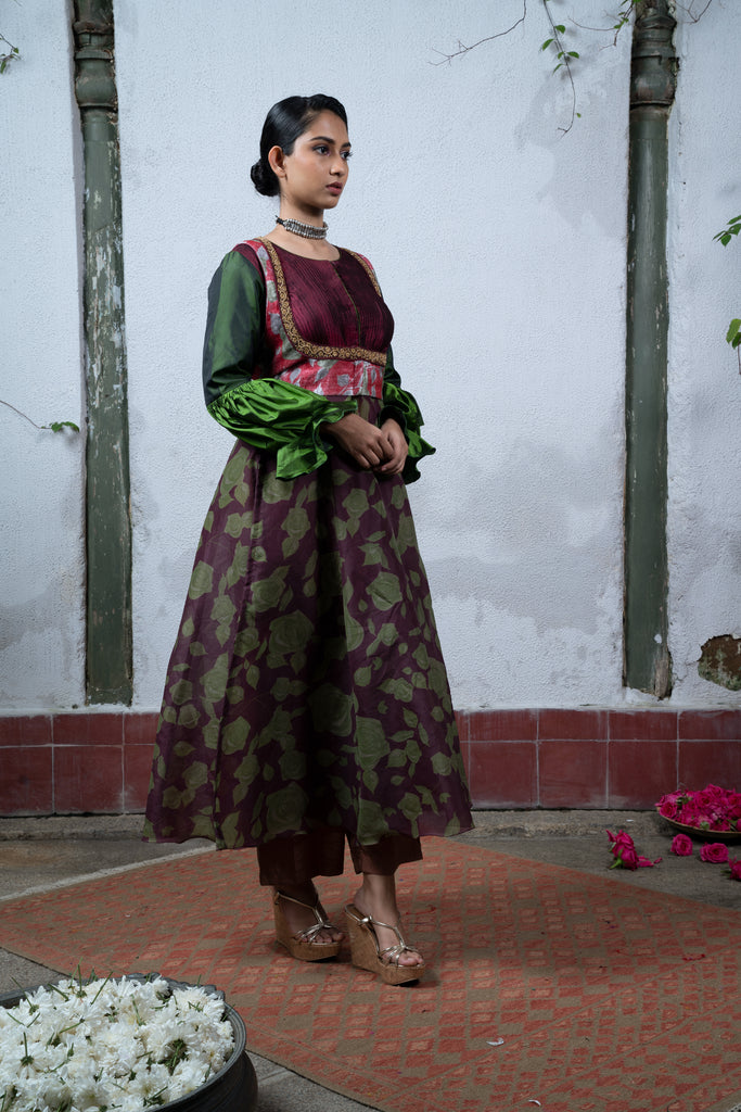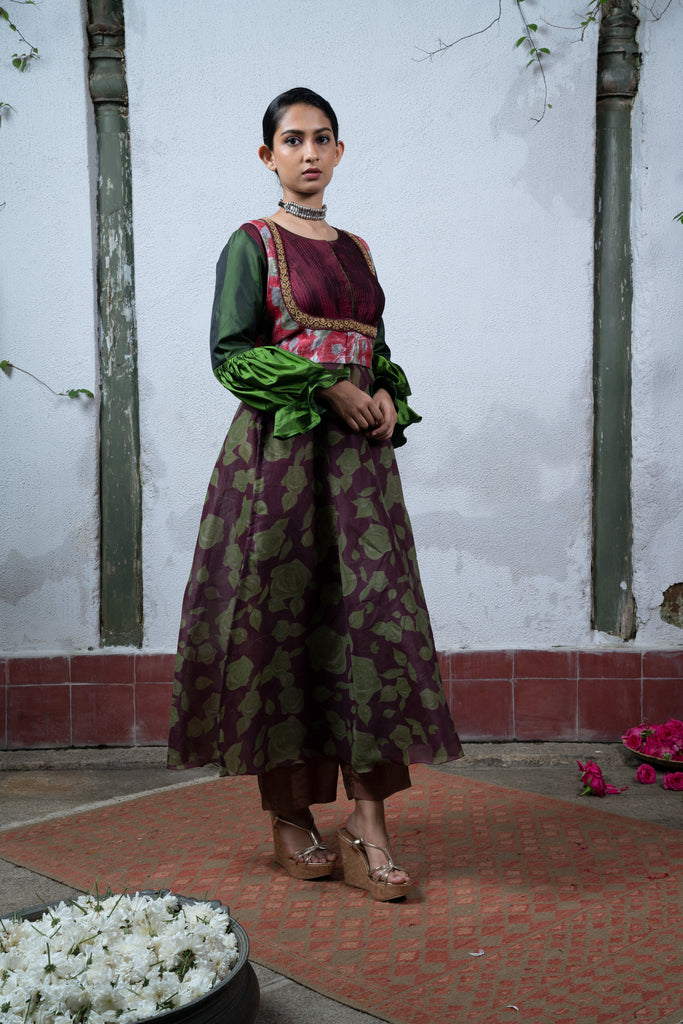Stay warm, festive, and fashion forward! Get dolled up this winter by flaunting this luxurious Organza salwar set in deep green and maroon with in-house digital floral prints (eco friendly), a pintuck yoke, and a velvet sleeveless jacket with digital prints!