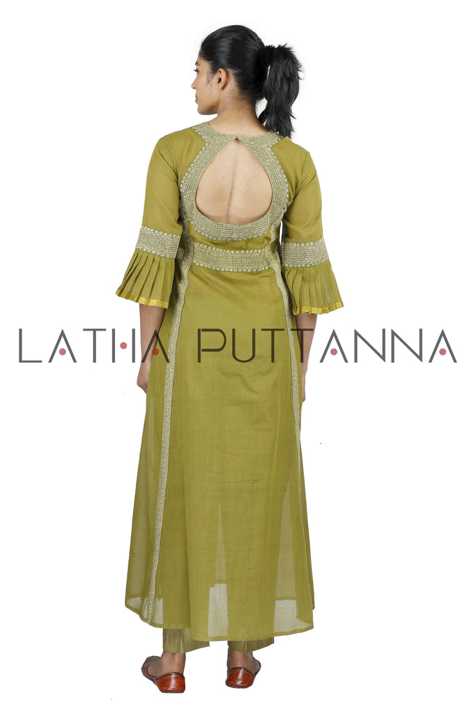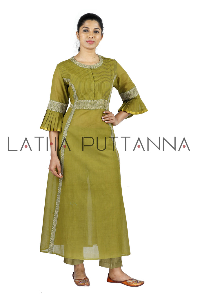 Want to turn heads wherever you go? Now you can look like a true vision in mehendi green with this luxurious Chanderi kurta adorned with intricate gold embroidery and matching crop pants!