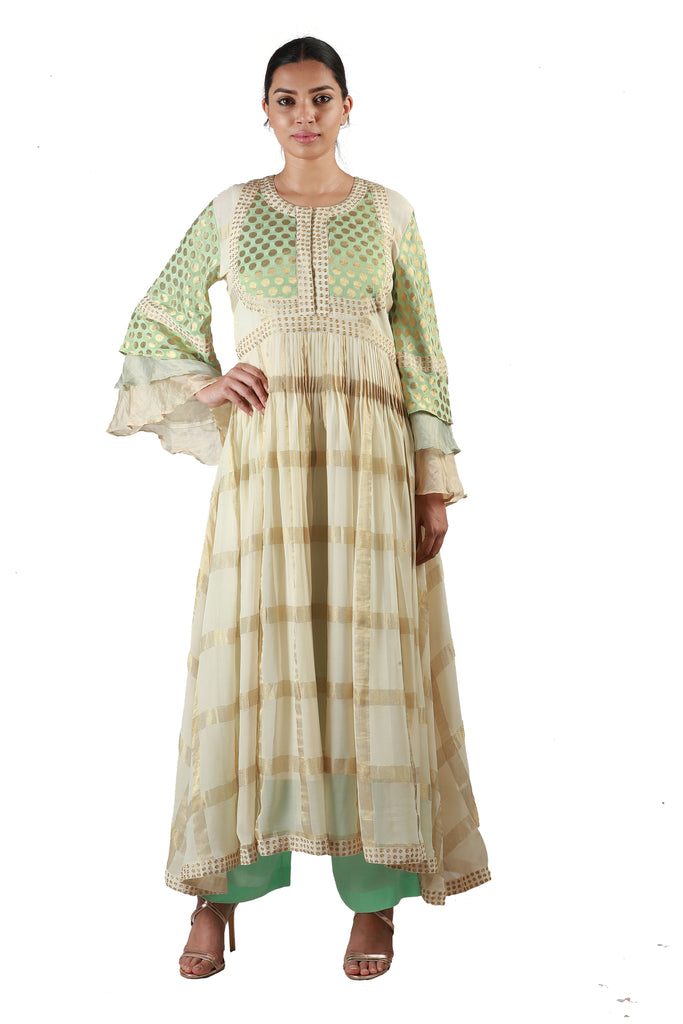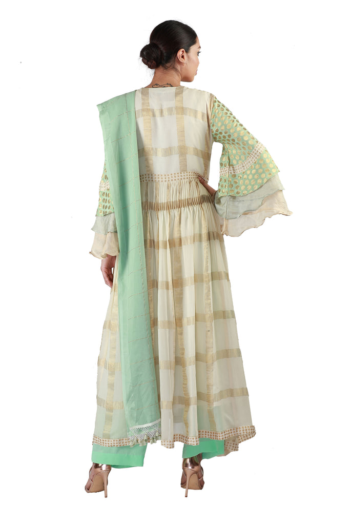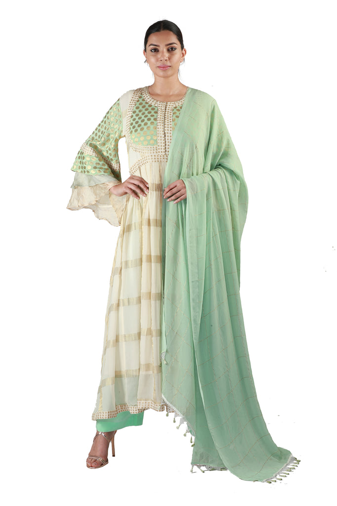 Excited to welcome the festive season? Let your unique sense of ethnic fashion shine with this luxurious georgette bell-sleeved salwar in off-white, embellished with broad woven gold checks, paired with a mint green georgette dupatta with thin checks and mint green crepe pants.