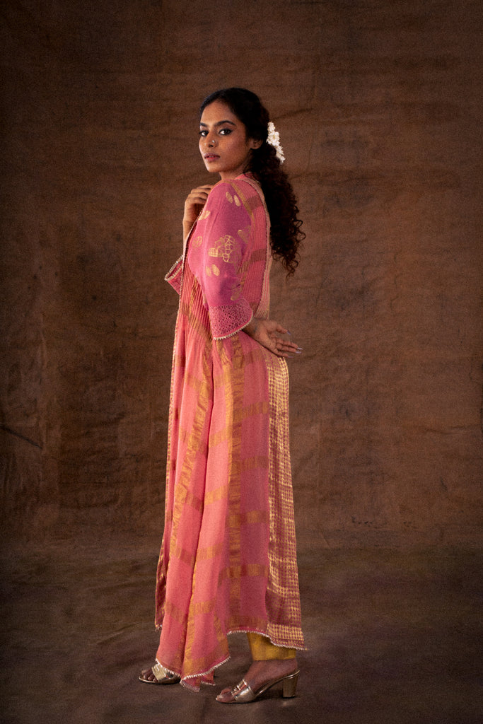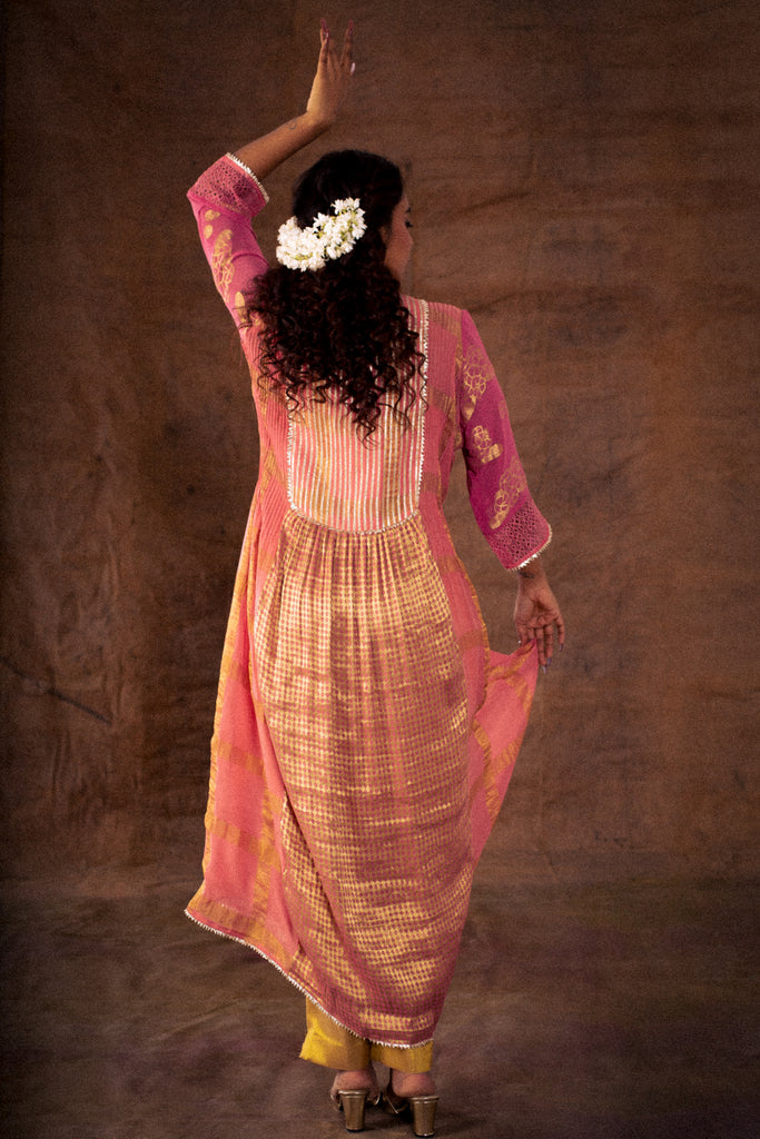 It's a party ! And if you're a fan of the palette, this pink woven georgette top with cluster of flowers and tiled brocade motifs, and Kanjivaram tissue yoke is the perfect addition to your wardrobe.
