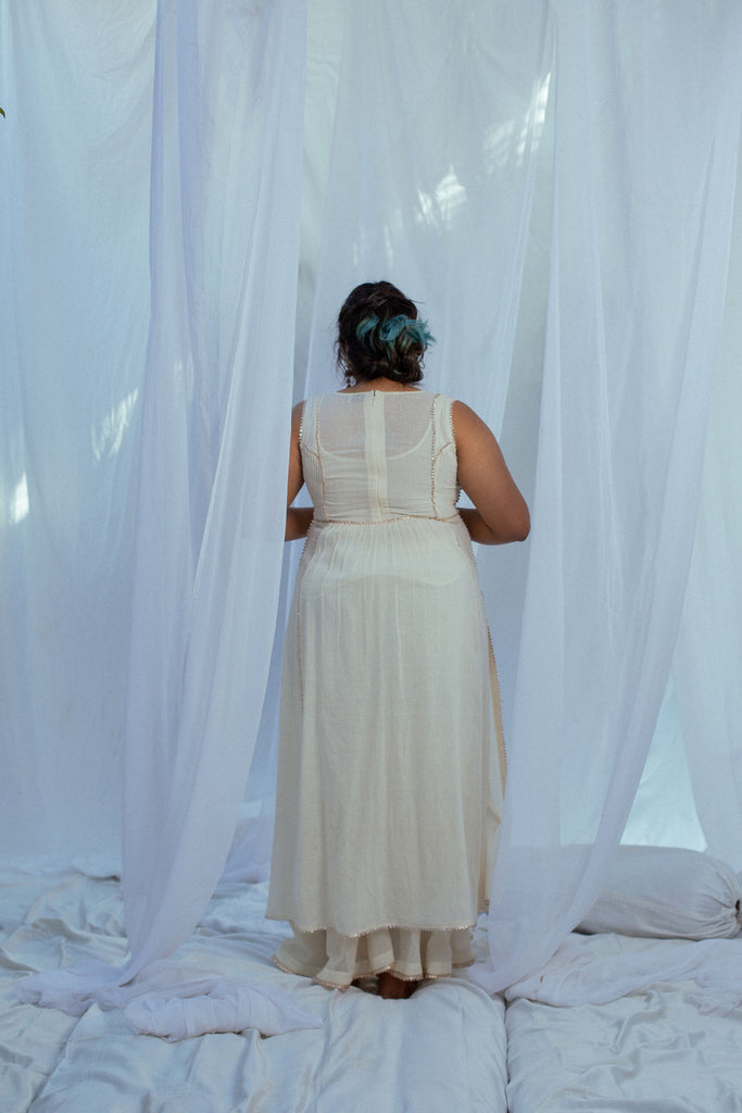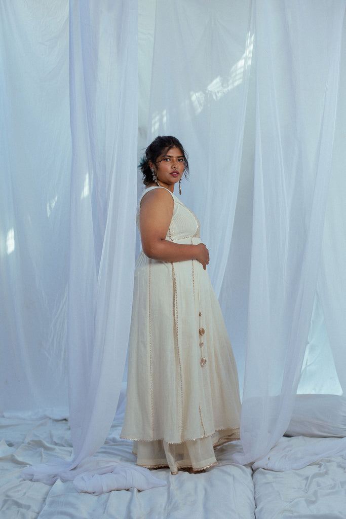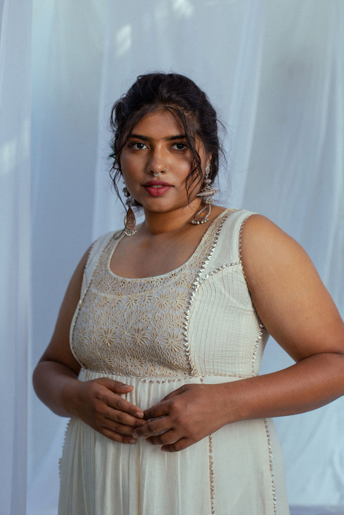 Be effortlessly elegant in this off-white sleeveless long top, designed with premium hand-woven cotton and detailed with cutwork on the yoke.