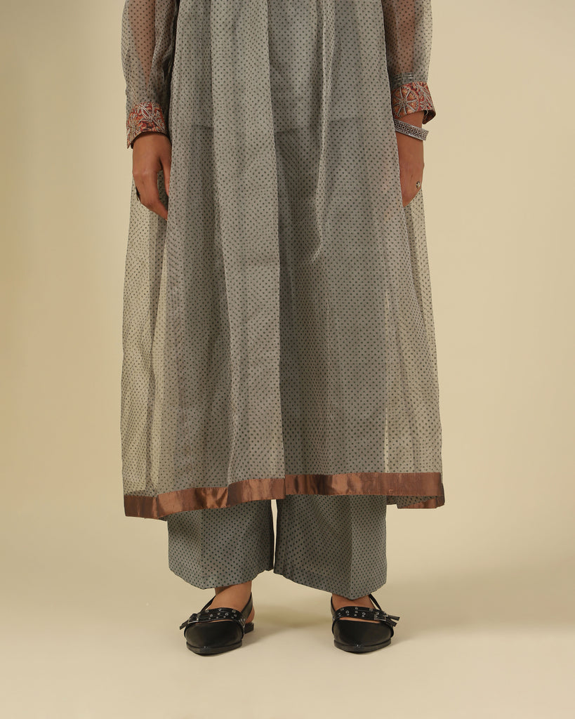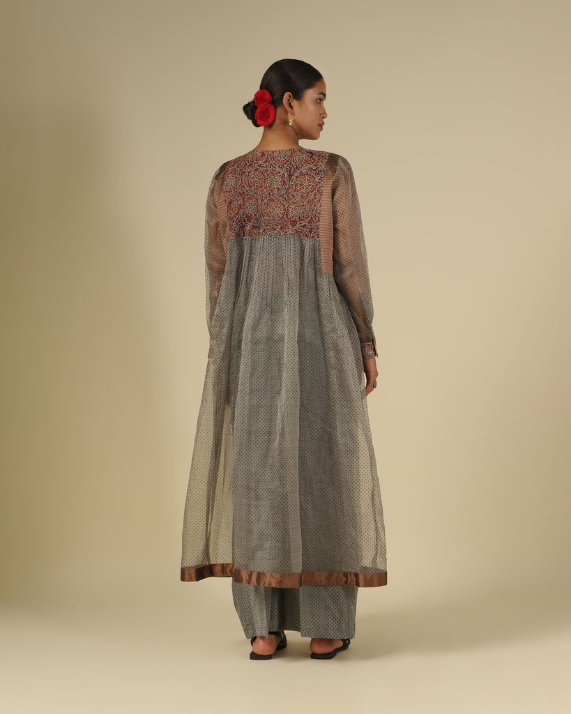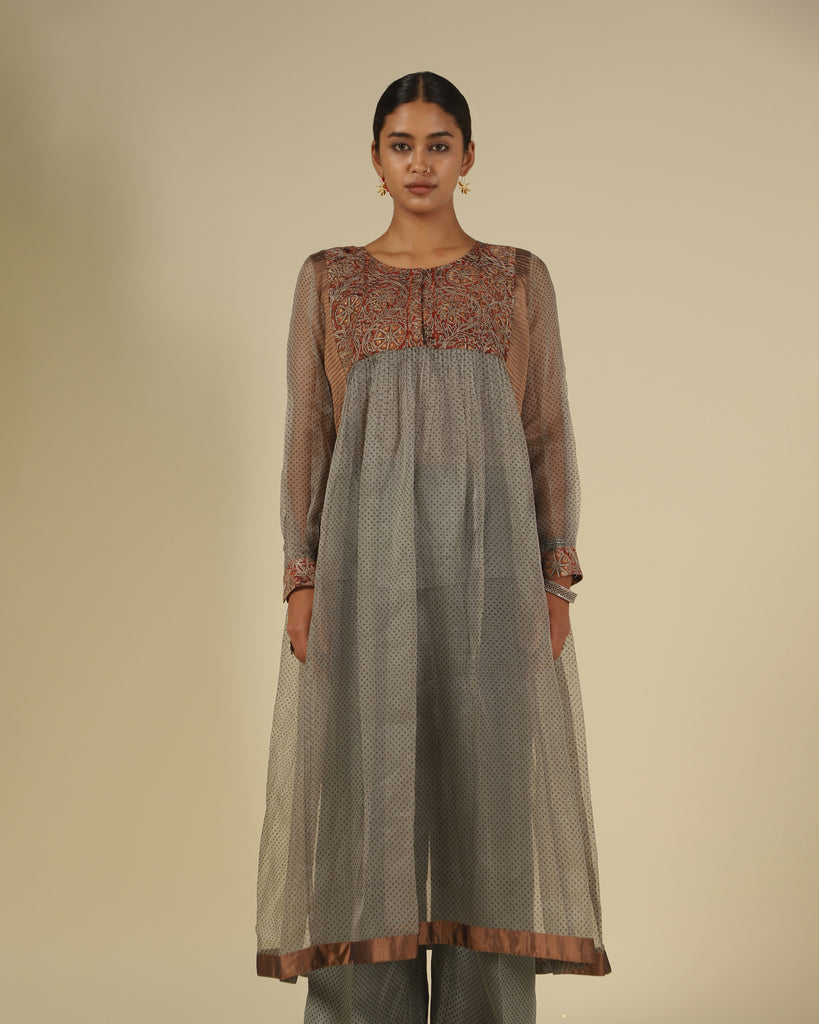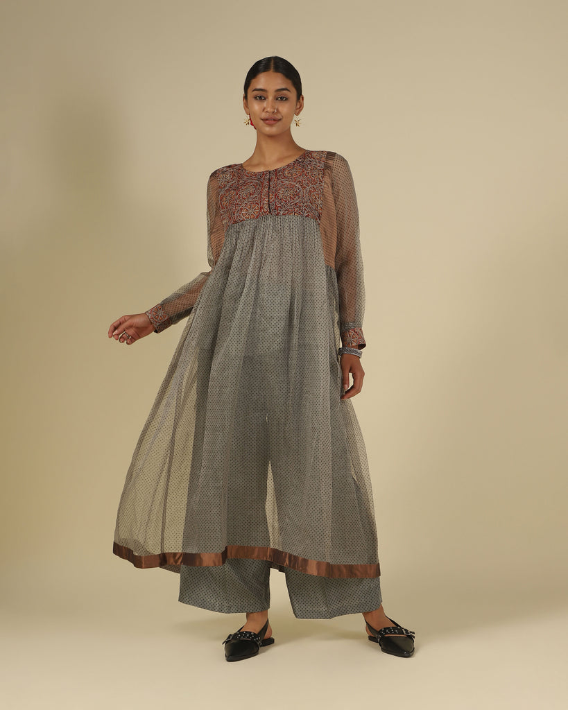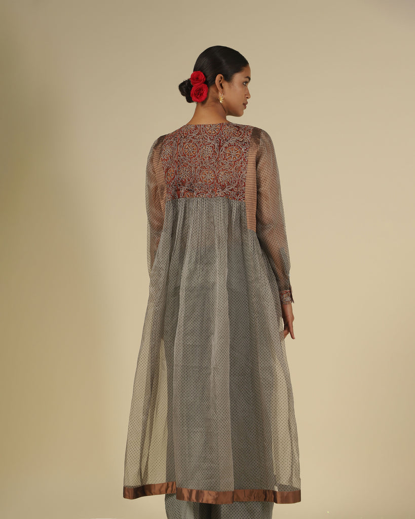 Soft and serene, this ensemble in Ash Grey reflects understated elegance through refined craftsmanship. The organza top features fine pin tucks and subtle block printing, complemented by a beautifully detailed Kalamkari yoke enriched with silk thread embroidery that adds warmth and intricacy. A soft silk slip underneath enhances its fluid drape, while soft silk block printed trousers in matching tones complete the look. Accents of Walnut Brown and Terracotta Red bring gentle contrast, creating an ensemble that feels poised, earthy, and effortlessly sophisticated.