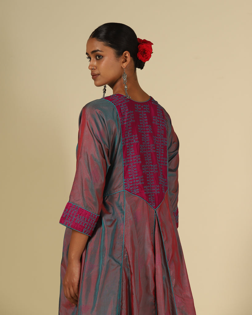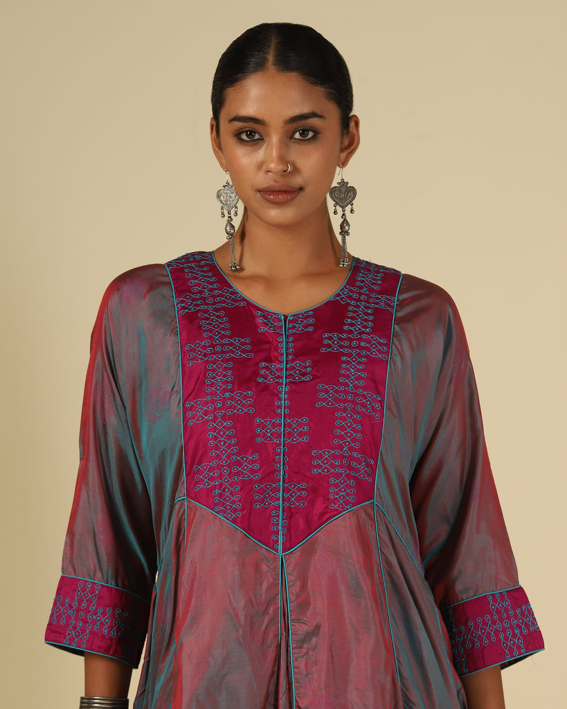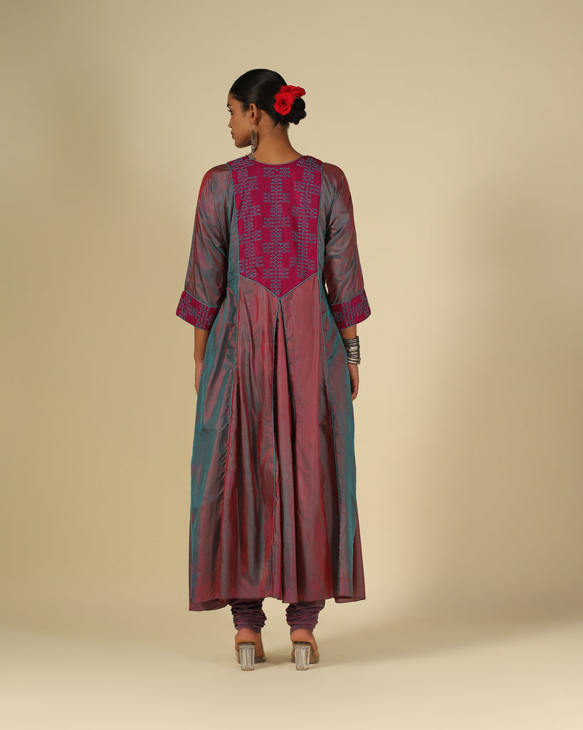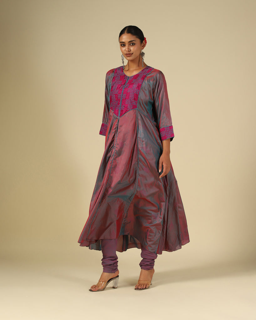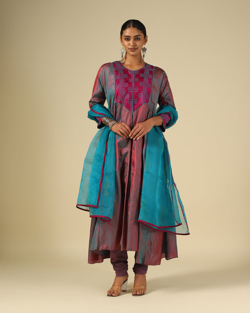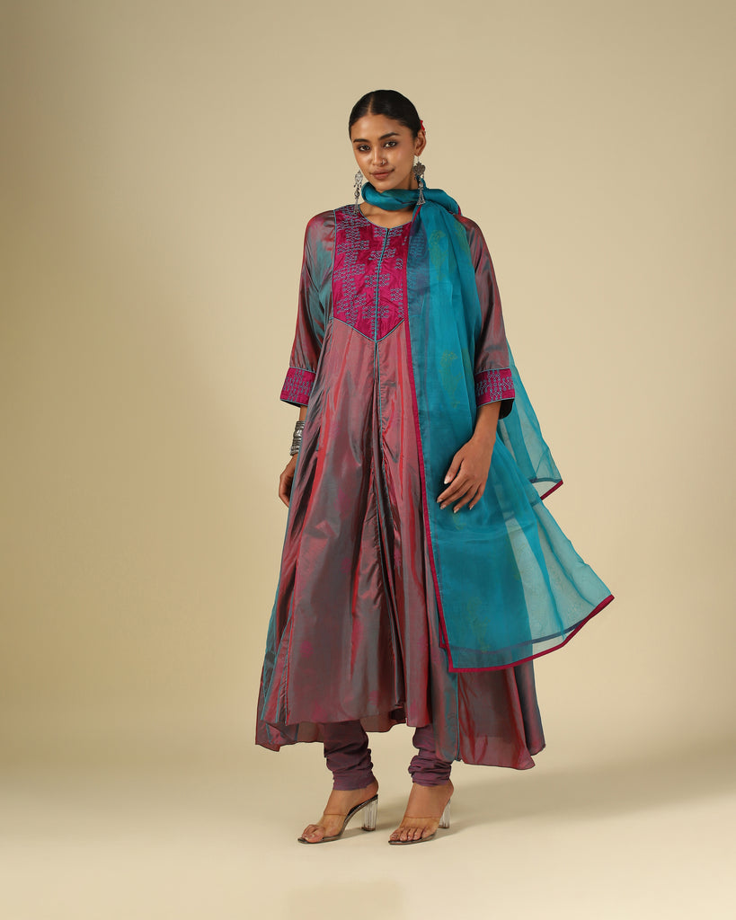 Radiant and refined, this Iridescent Mauve and Middle Blue set captures the beauty of shifting light and intricate craftsmanship. The Chanderi top shimmers with subtle hues of mauve and pink, brought to life through detailed silk thread embroidery that adds depth and texture. The cotton silk churidar offers a soft, structured balance, while the organza dupatta in a calming Middle Blue lends an airy, luminous finish. Graceful, contemporary, and effortlessly elegant—this ensemble is made for moments that call for quiet sophistication.
