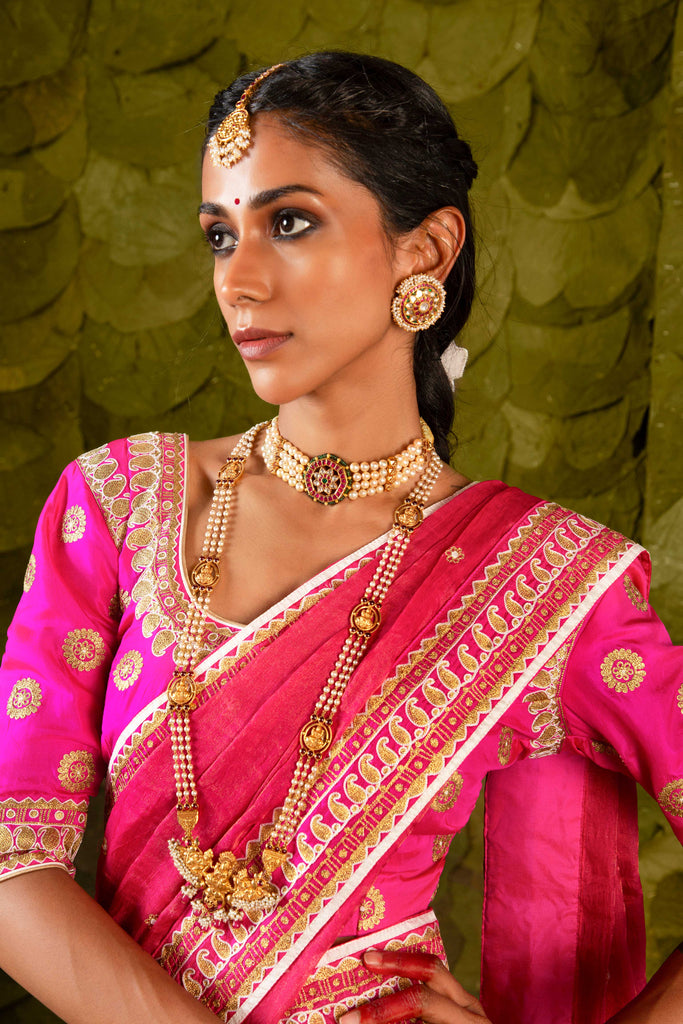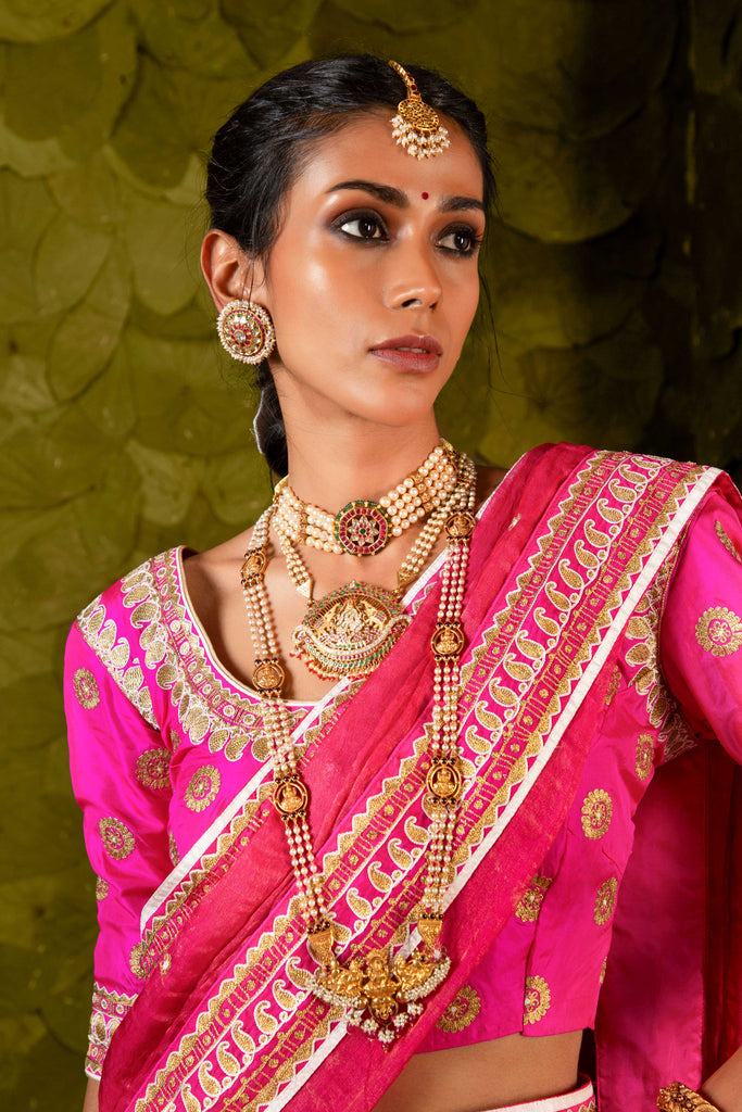 Radiate timeless charm in the Shocking Pink Lehenga ensemble comprising a skirt, blouse, and dupatta meticulously crafted from Karnataka Silk and Banarasi Tissue. Embellished with Silk tape, exquisite Aari gold zari machine embroidery, and intricate Silk thread machine embroidery, this attire embodies opulence and sophistication.