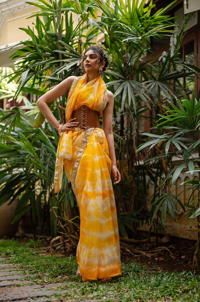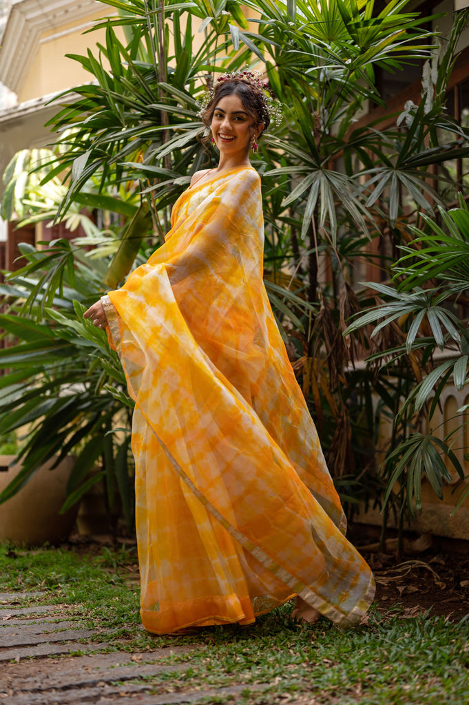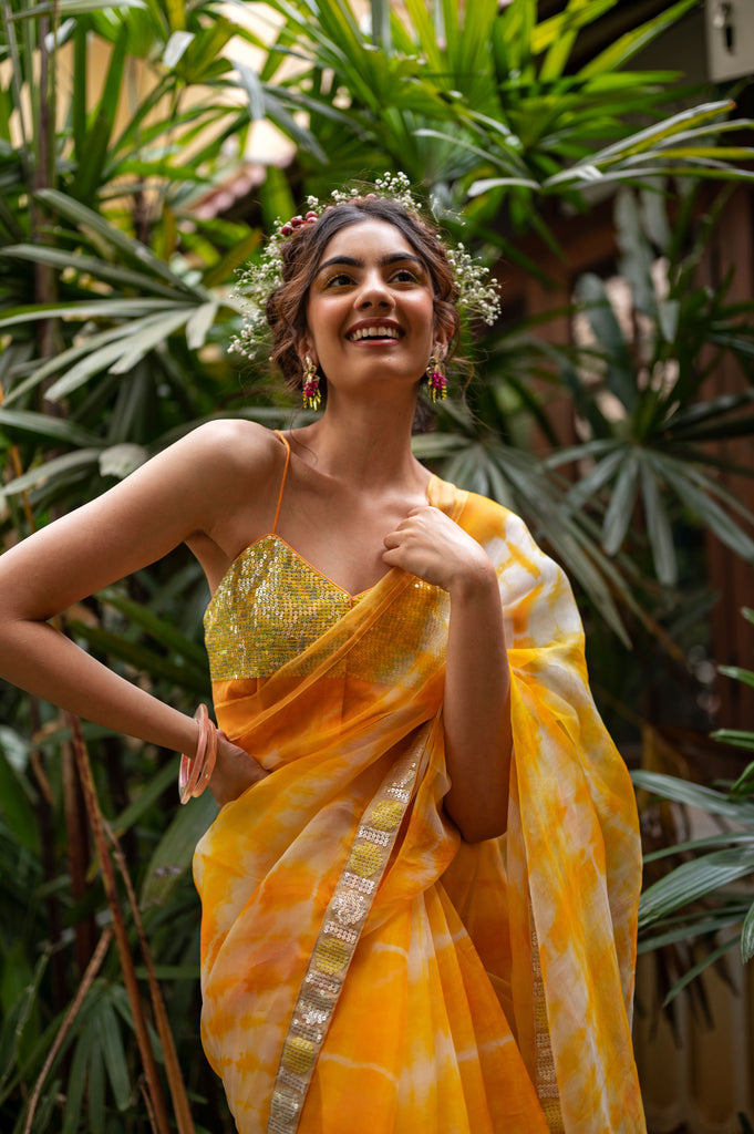Love the old world charm of Bollywood heroines? Bring back the magic of the summer saree with this organza tie and dye number, detailed with hand embroidered sequins xof polka dots at the border.