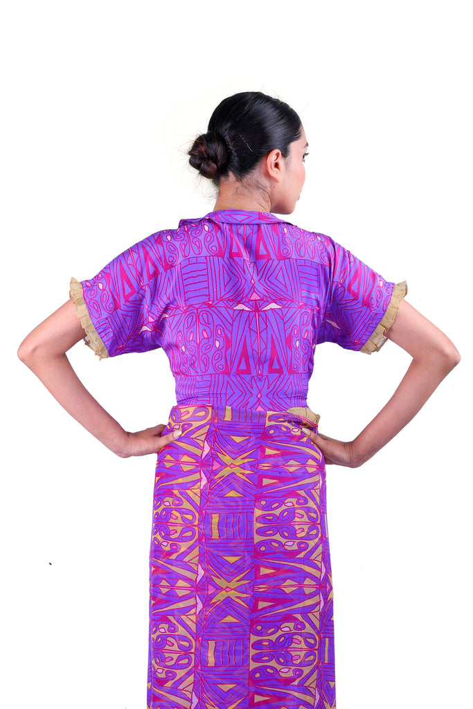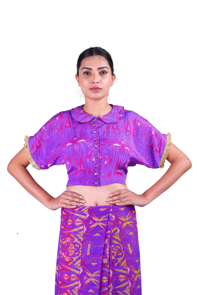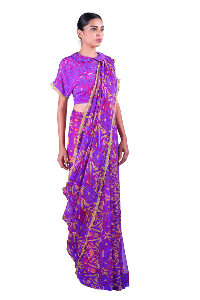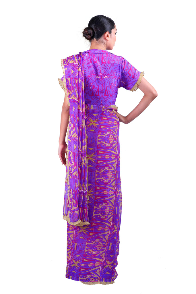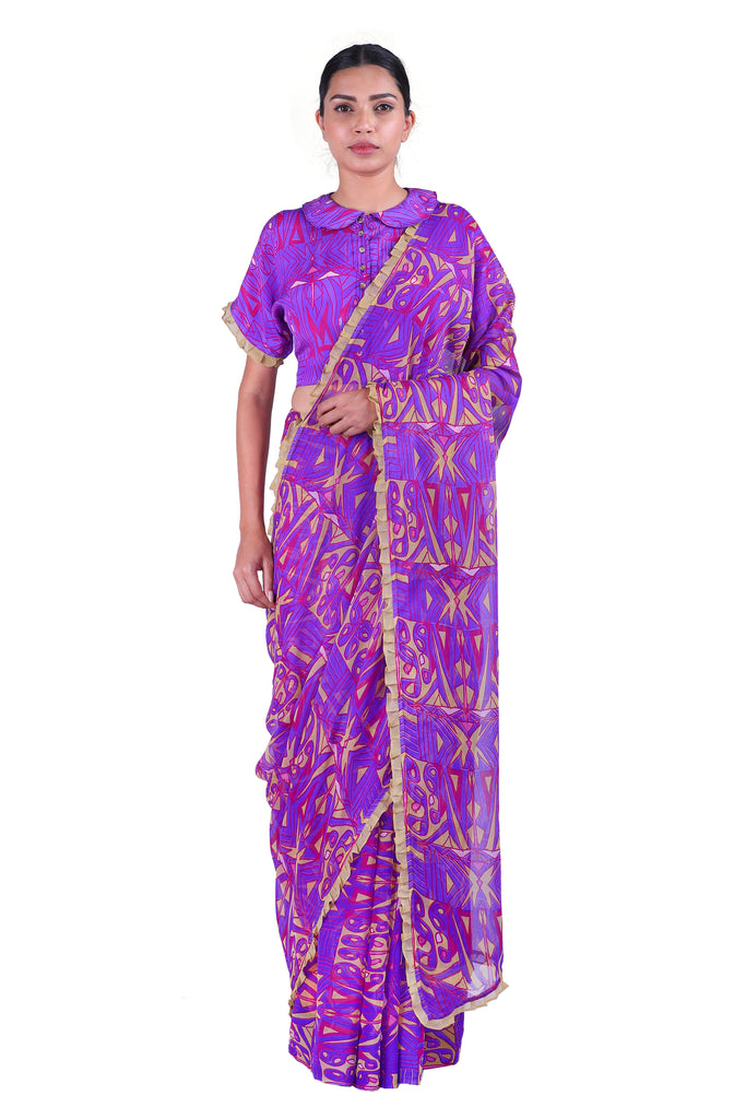 Ready to bring back the glory days of the Bengaluru summer? Nothing says it better than these classic Purple printed chiffon sarees with iconic Latha Puttanna prints, embellished with ruffles and paired with a matching blouse.