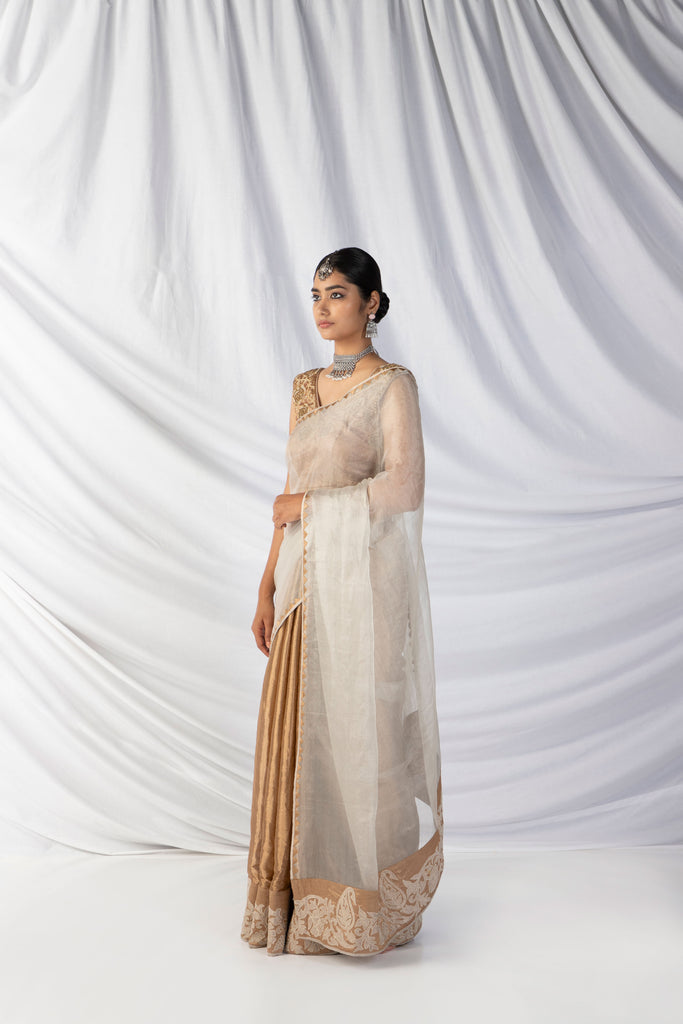 The Shwetambri Saree and Blouse in Concrete Silver and Latte Gold exude modern sophistication. The sleek silver hue pairs effortlessly with warm latte gold accents, creating a chic ensemble perfect for elegant events and celebrations.