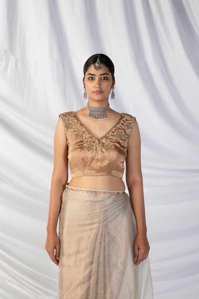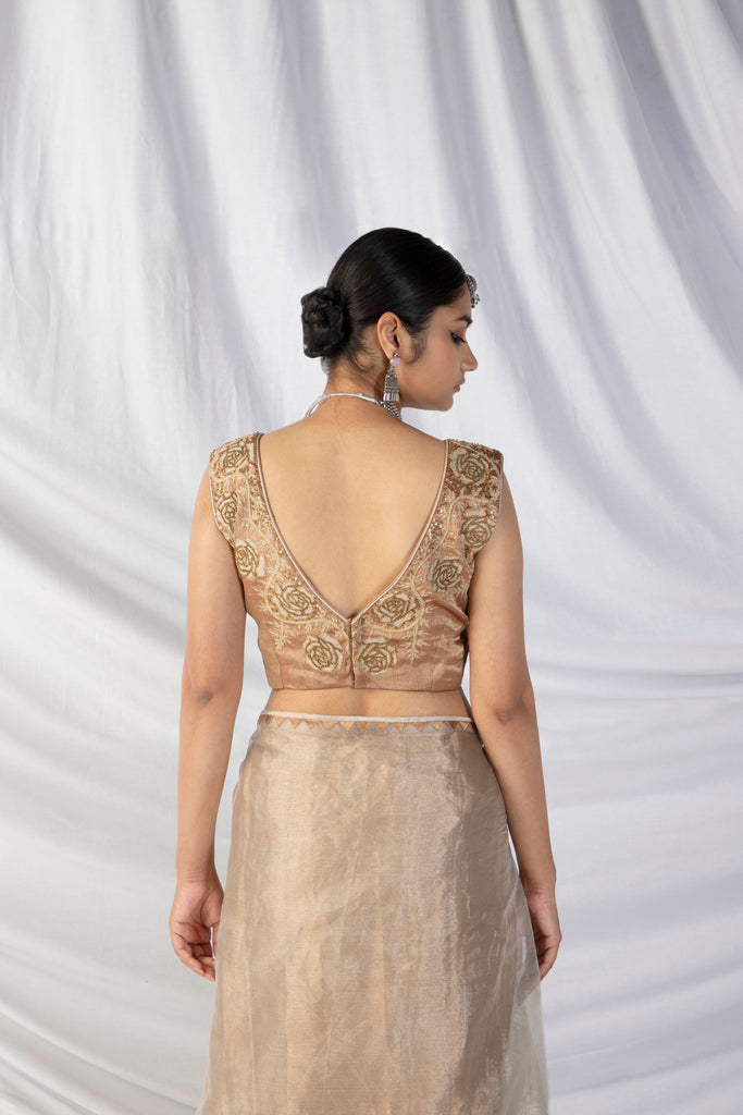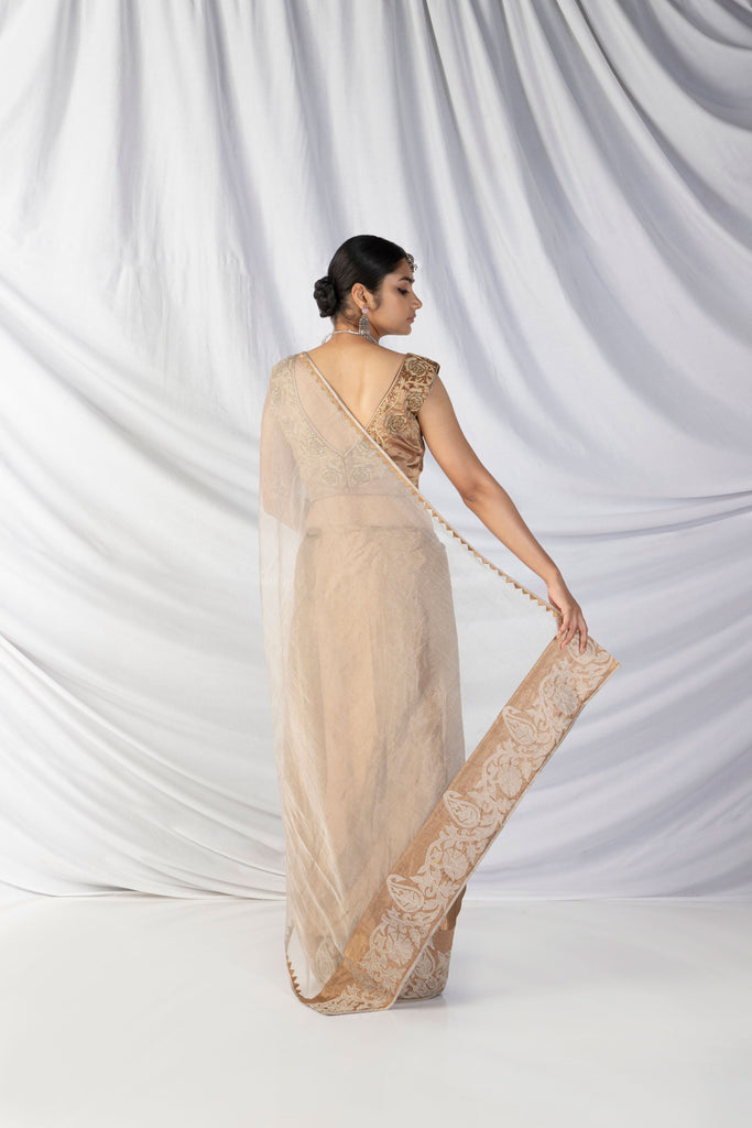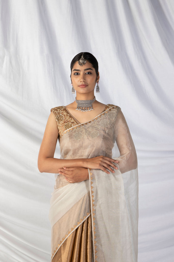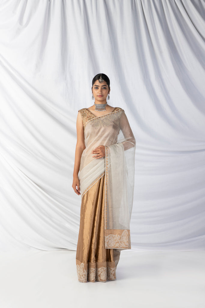 Shwetambari Saree And Blouse Set In Concrete Silver And Latte Gold