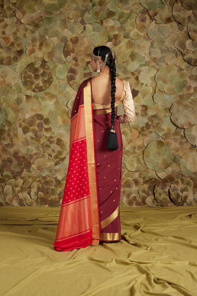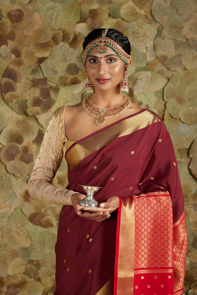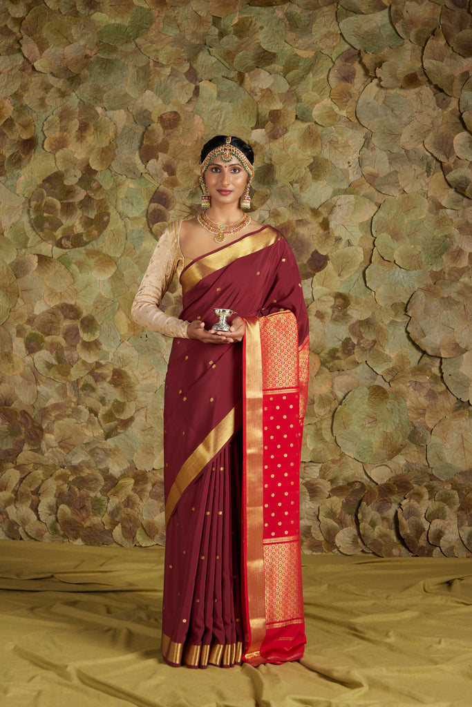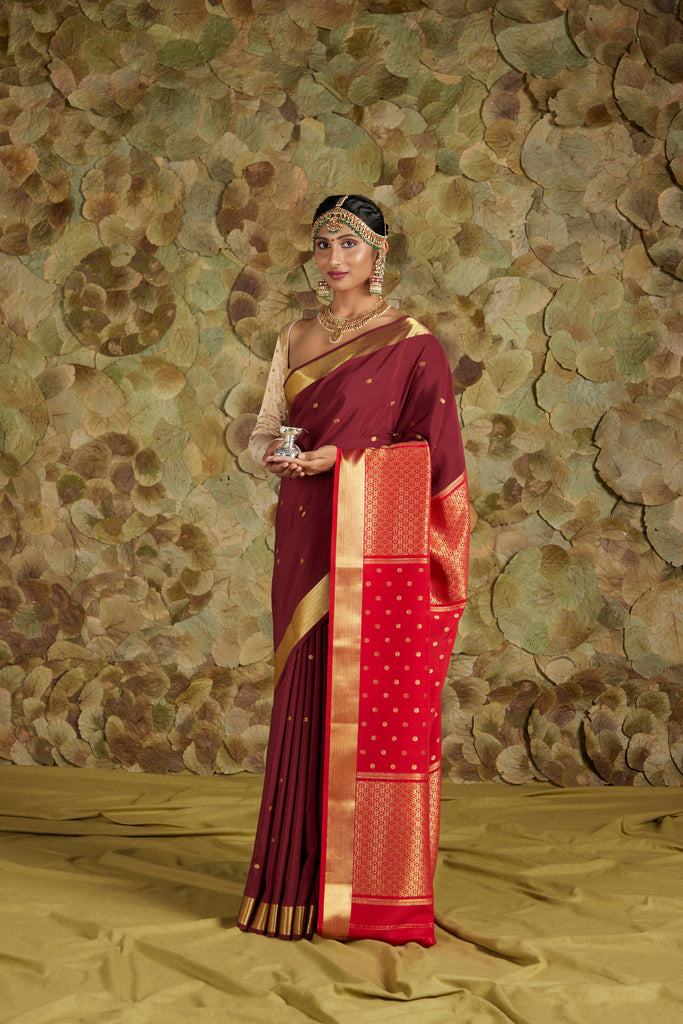 Enchant in a Deepa saree in Baked Apple X Sparkling Grape / ಸೆಬು X ದ್ರಕ್ಷೆ ,meticulously crafted with intertwining strands of pristine pure gold zari and authentic Mysore crepe silk.