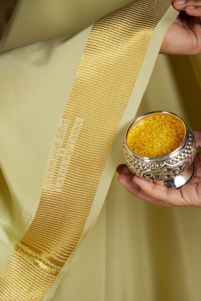 Disclaimer: The Sambandha collection 'Tamboola Series' features intricately woven sarees in pure gold jari, that is a collaboration between Latha Puttanna, who has garnered a reputation over the last 32 years for her extraordinary design expertise and Chamundi Silks, a prestigious silk manufacturing institution celebrated for maintaining a flawless quality standard for 75 years.