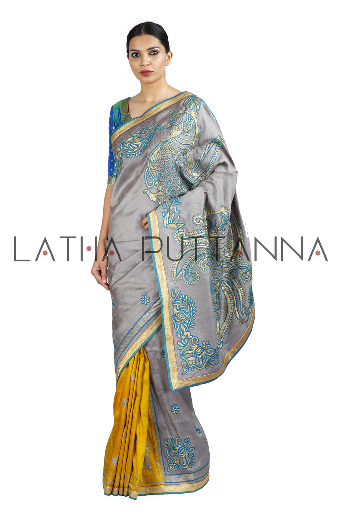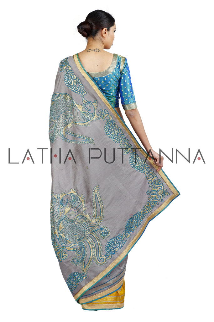 This half and half saree is made froman unusual combination of golden yellow and taupe grey softened raw silk fabrics. The two fabrics are seamlessly attached with beaten gold and thread embroidered flower buttasstrewn on the entire saree with gold and blue silk patti as the border. Two dramatic dancing peacocks adorn the pallu. This dramatic saree is complemented by a peacock blue silk blouse with beaten gold embroidery.