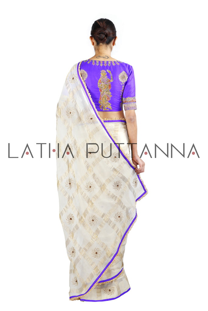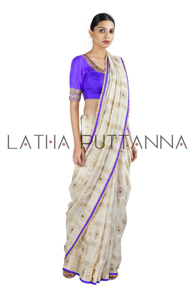 This georgette off-white saree has gold checks interspersed with Chakra motifs embroidered in thread and sequins. A combination of violet silk patti and gold tissue frill creates a unique border. The violet silk blouse has a dancing girl embroidered in multi-coloured threads and sequins on the back completing this stunning creation.