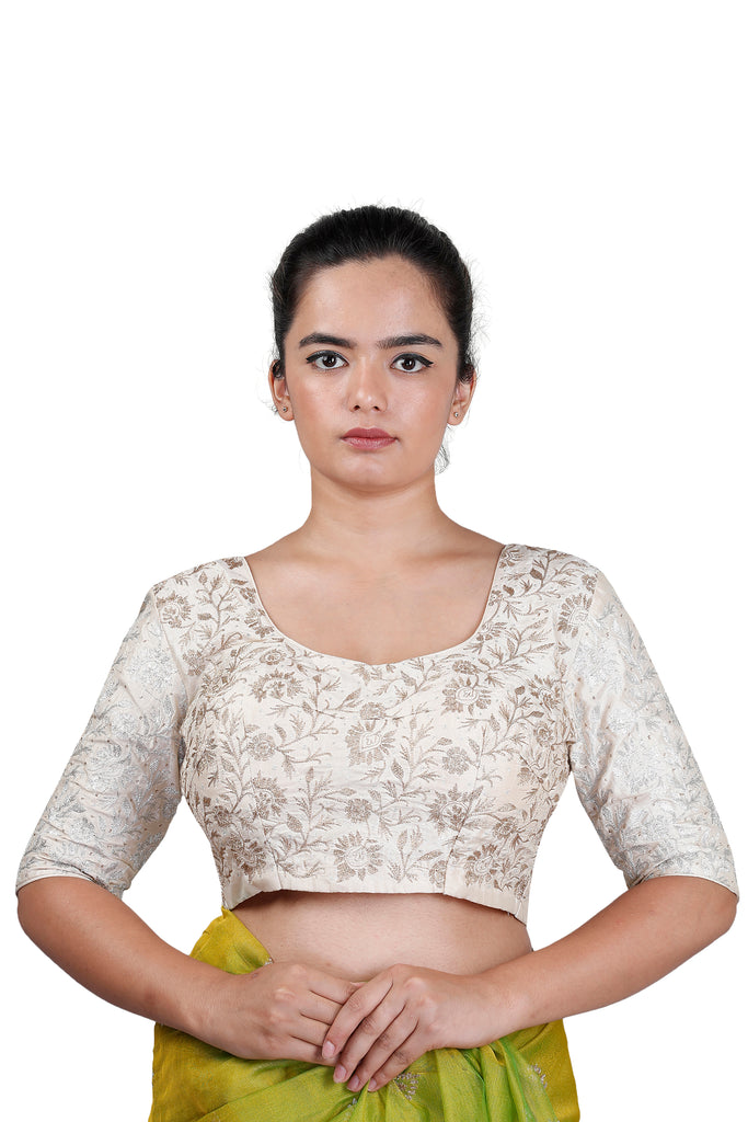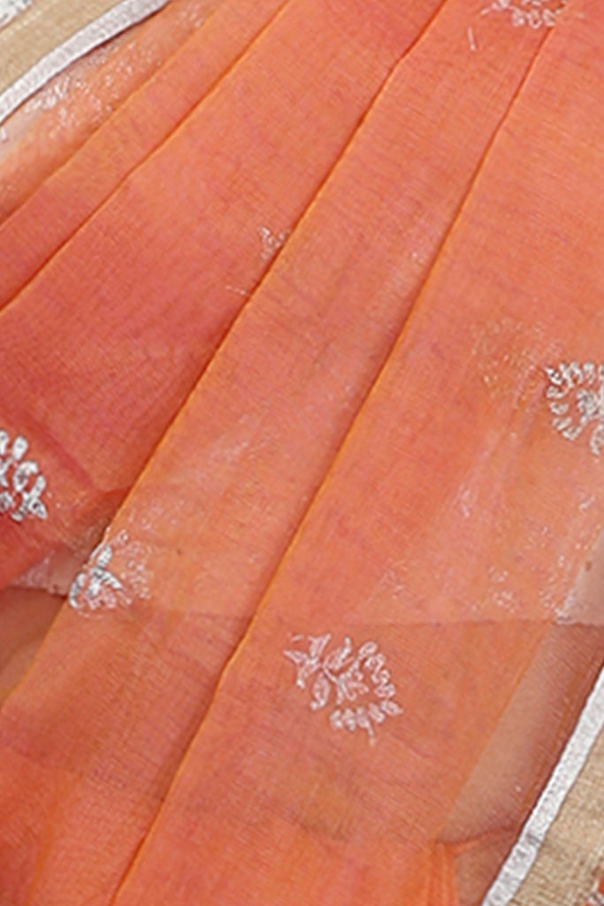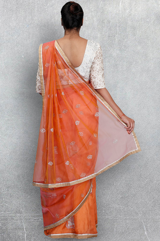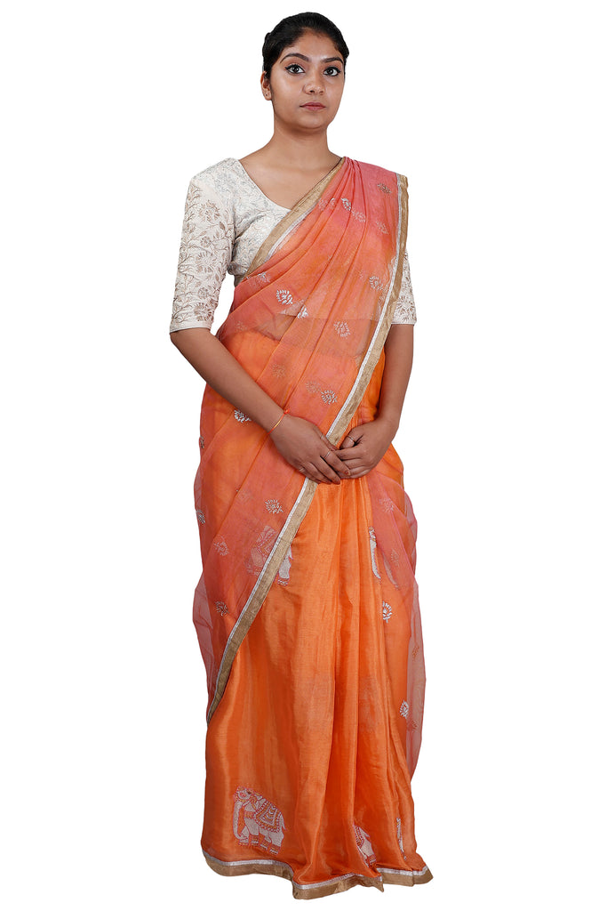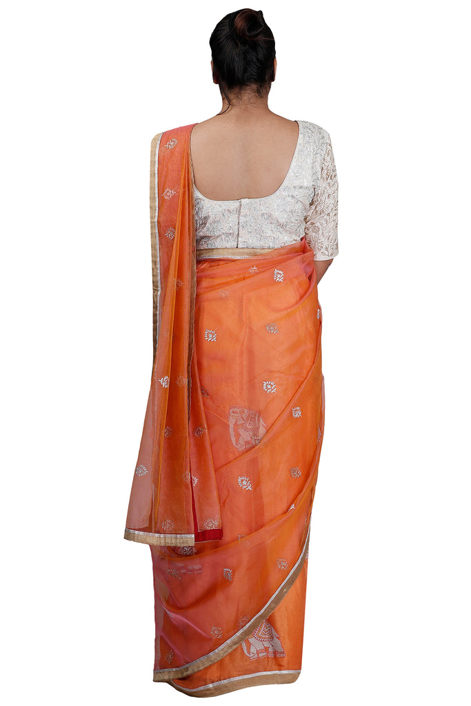 Drape yourself in style this winter with this gorgeous raw silk and organza half-and-half saree in orange, with stunning gold zari embroidery, elephant and floral motifs, and a gold tissue border. The saree is paired with a white silk blouse with intricate zari work.