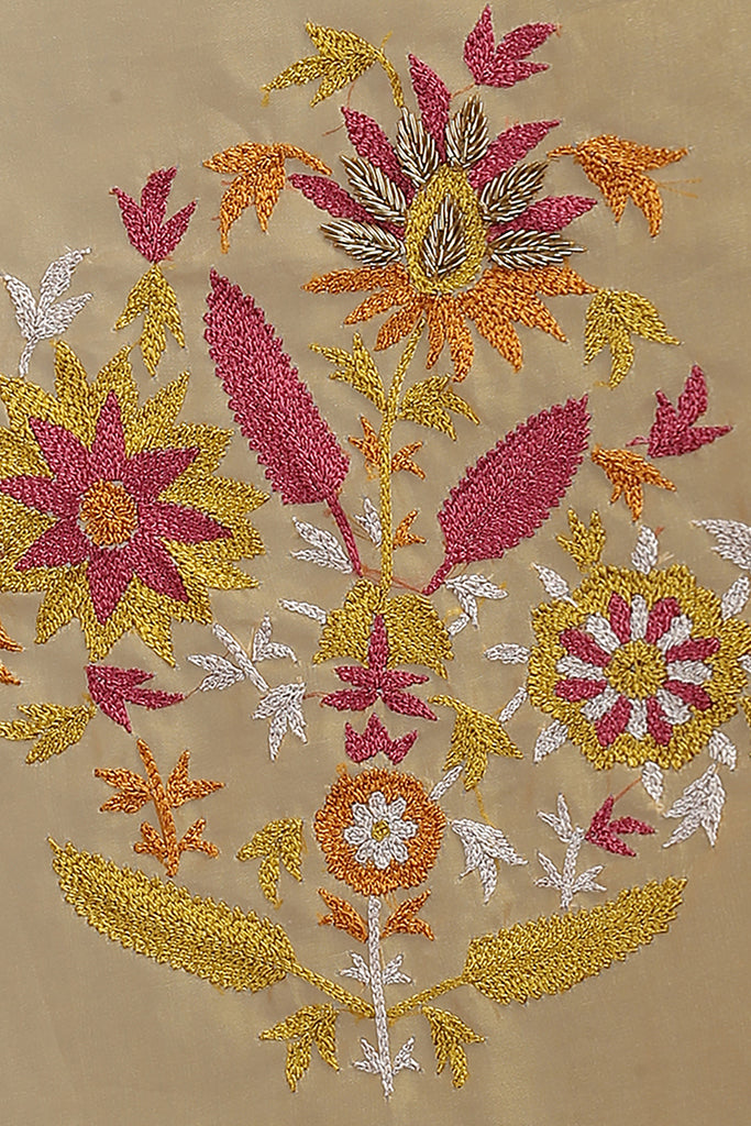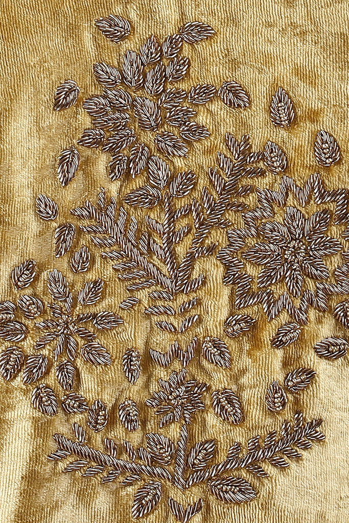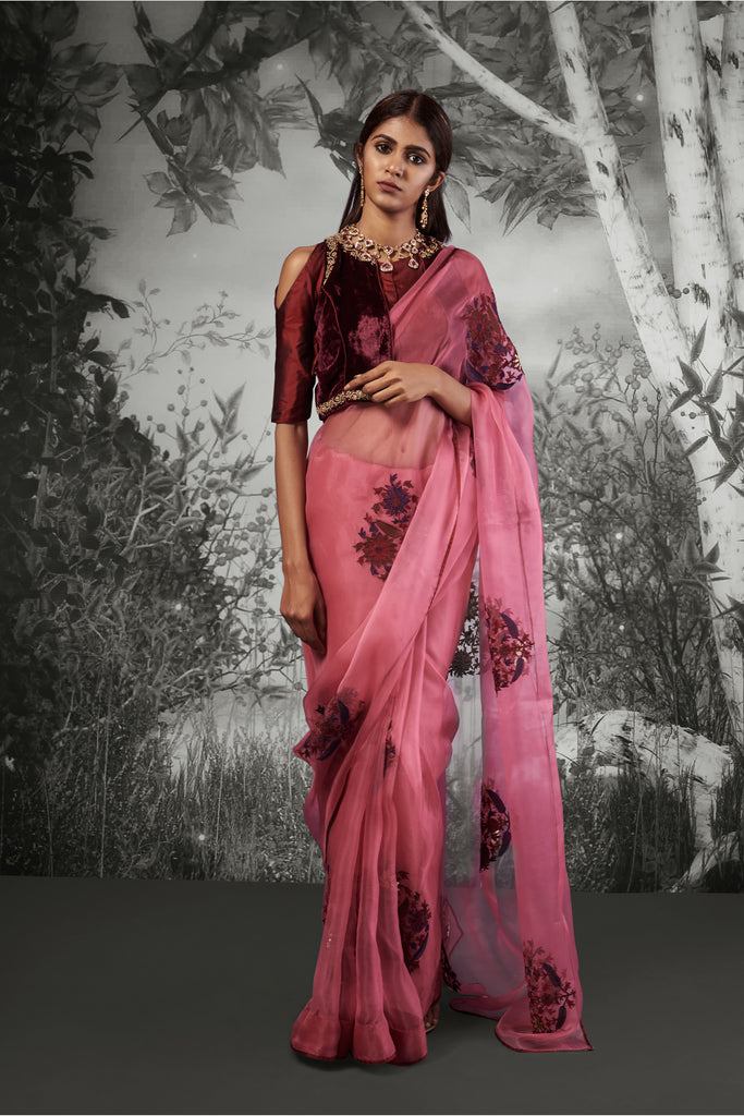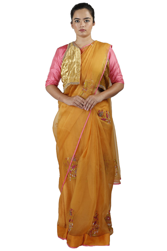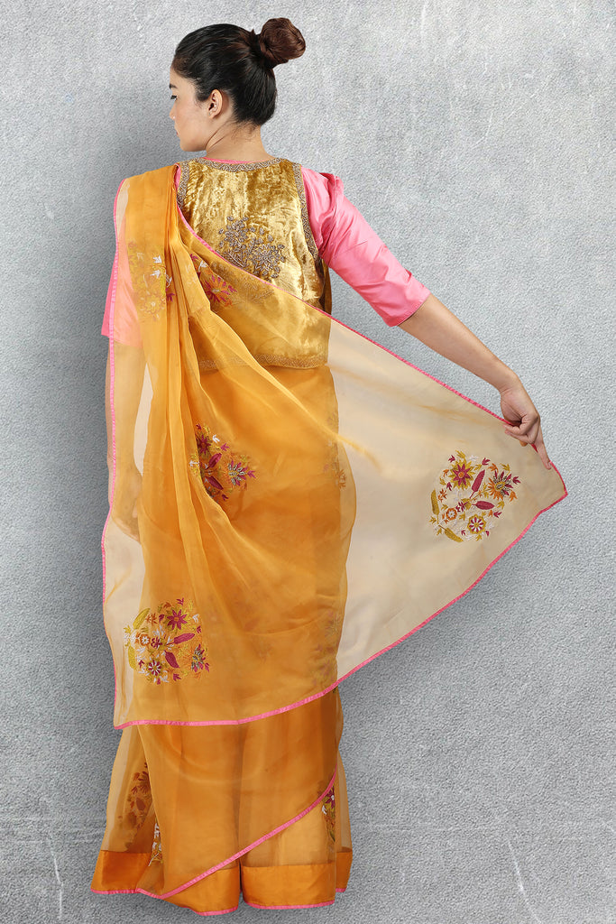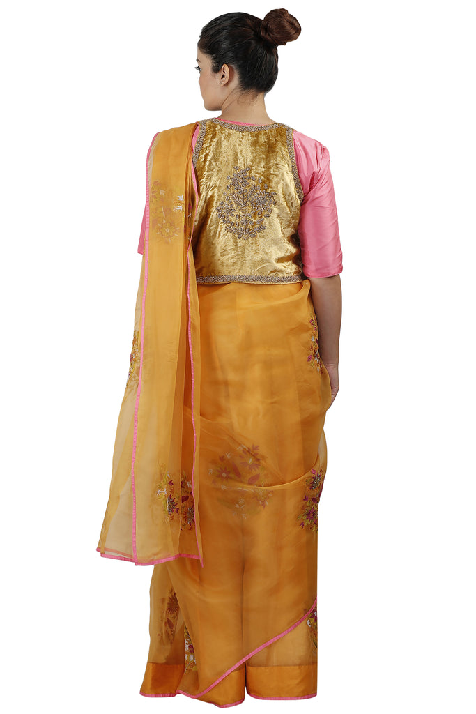 Drape yourself in style this winter with this gorgeous silk organza saree in orange, with stunning zari and thread embroidery. The saree is paired with a plain matching silk blouse with a velvet jacket that's detailed with gold zardozi embroidery.
