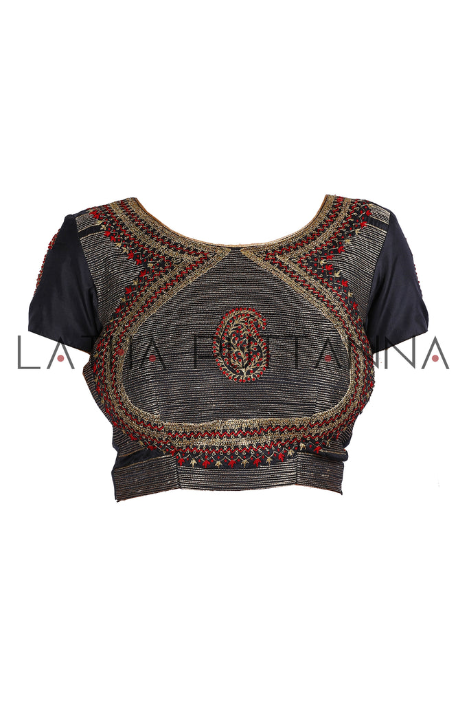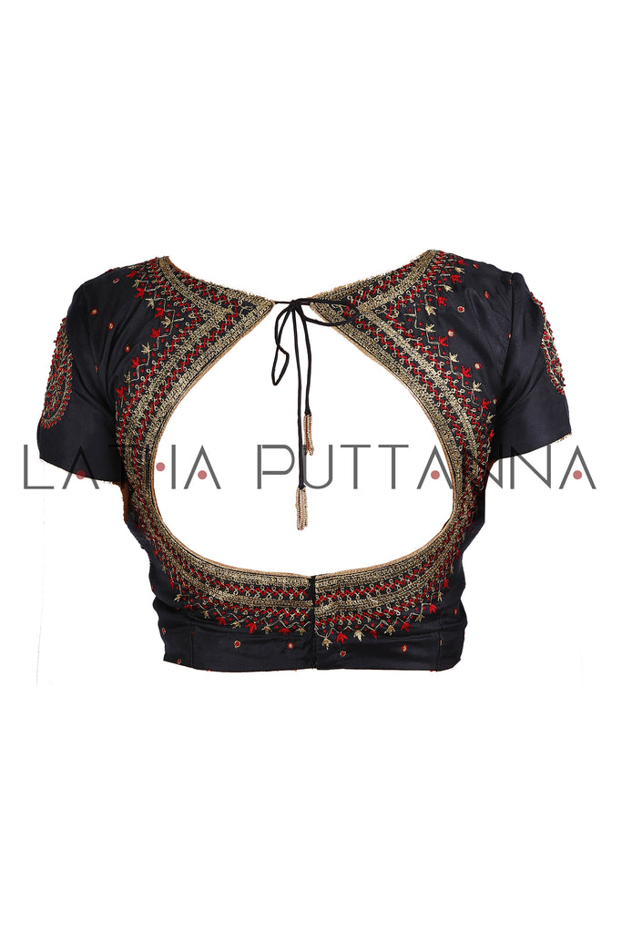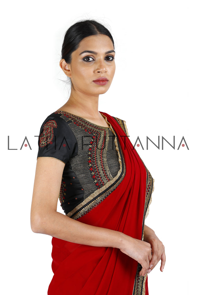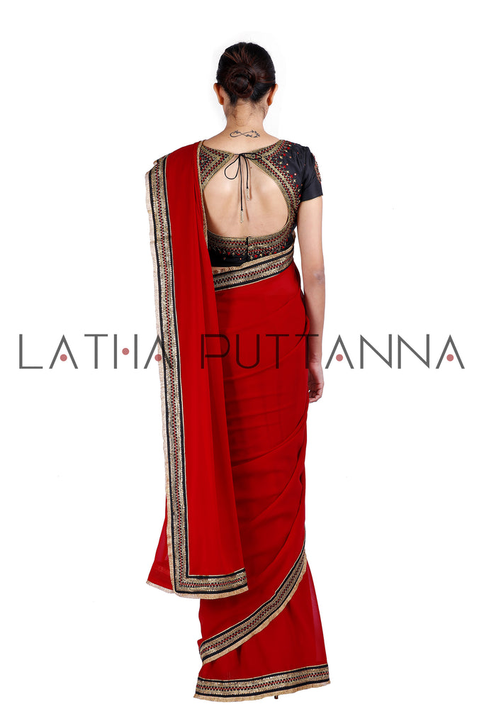A deep hued red georgette saree with black silk border adorned with intricate beaten gold embroidery in a traditional Kolam design and further embellished with thread and sequins. Complemented with an intricate black silk blouse with matching embroidery and a stunning Matka back. We so love this creation that it is in fact our Logo saree!