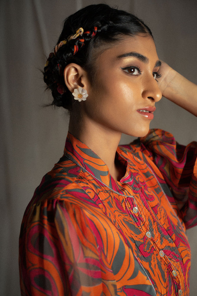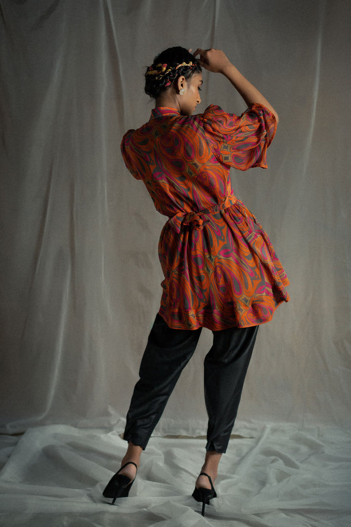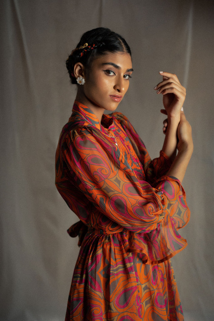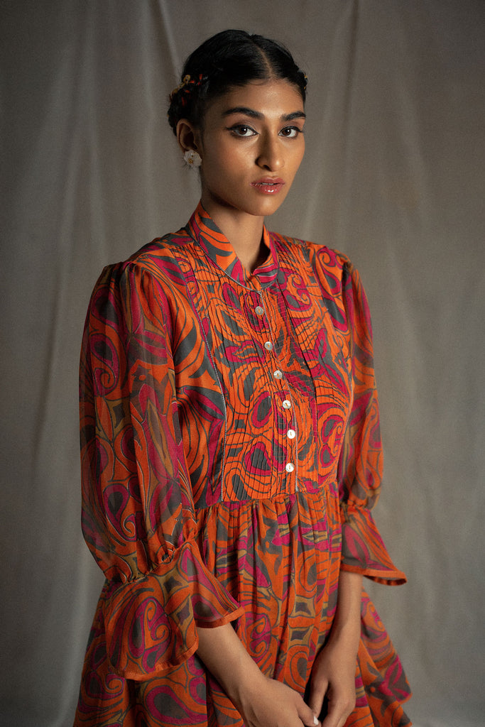 Flaunt your personality in this fun and flirty tunic dress in burnt orange, crafted from flowy printed chiffon pintuck at yoke and adorned with sash on the back.