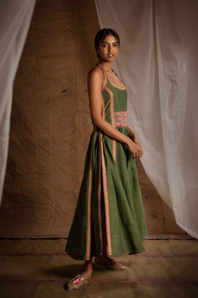 Looking for something traditional yet edgy? Jazz up your festive ensemble by donning this stylish Mangalgiri cotton dress in green, detailed with thread embroidery on the waist.