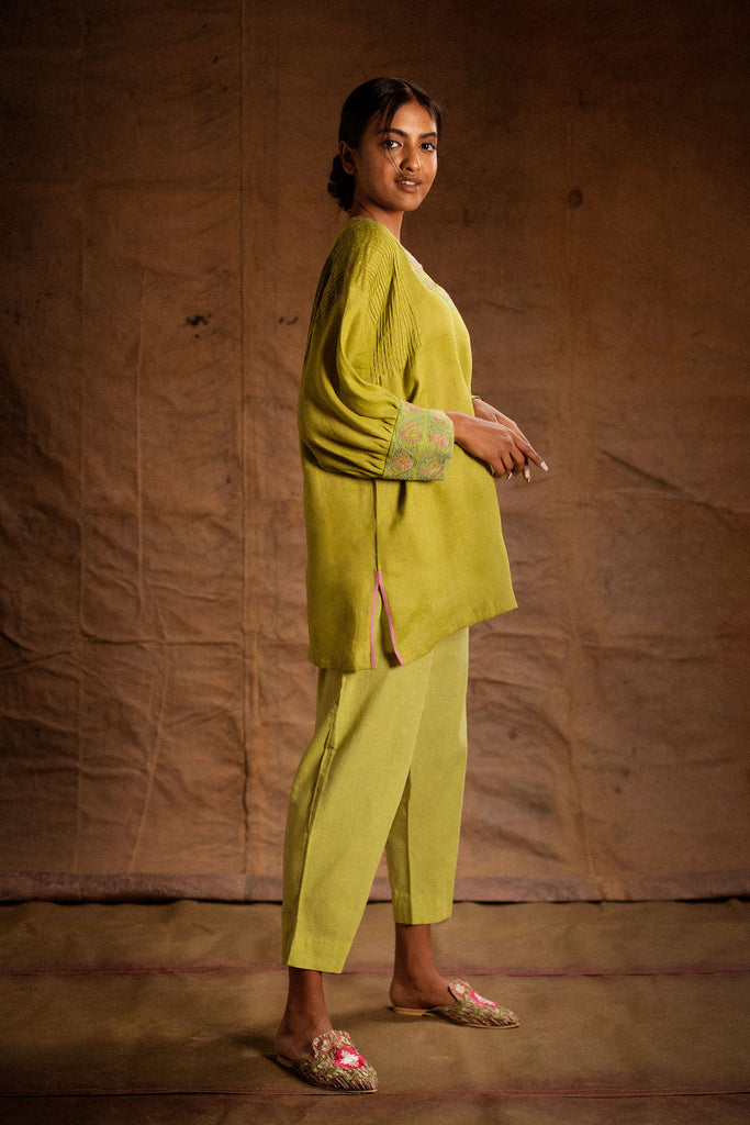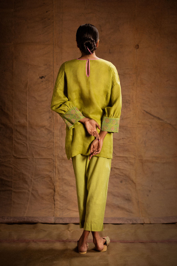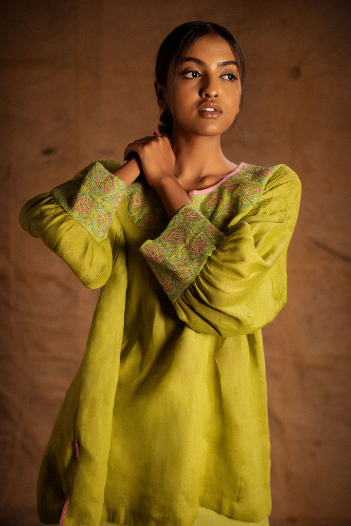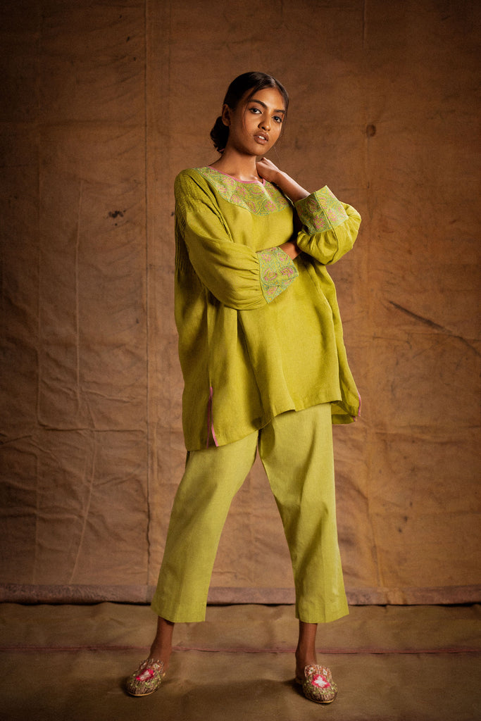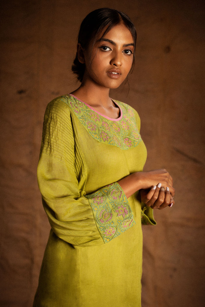 It's time to welcome summer in vogue with this warm and breezy tunic dress in Lemon green, designed with intricate thread embroidery over hand-woven organic linen.