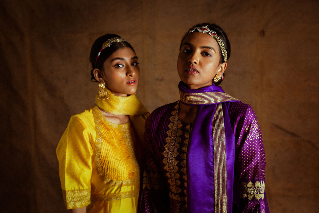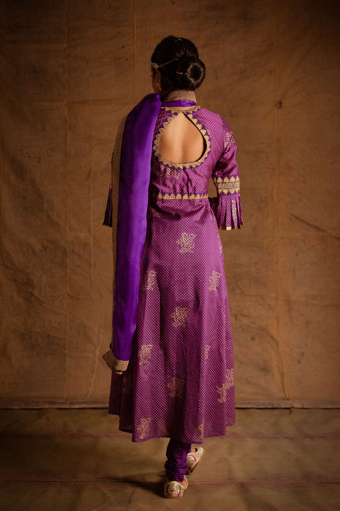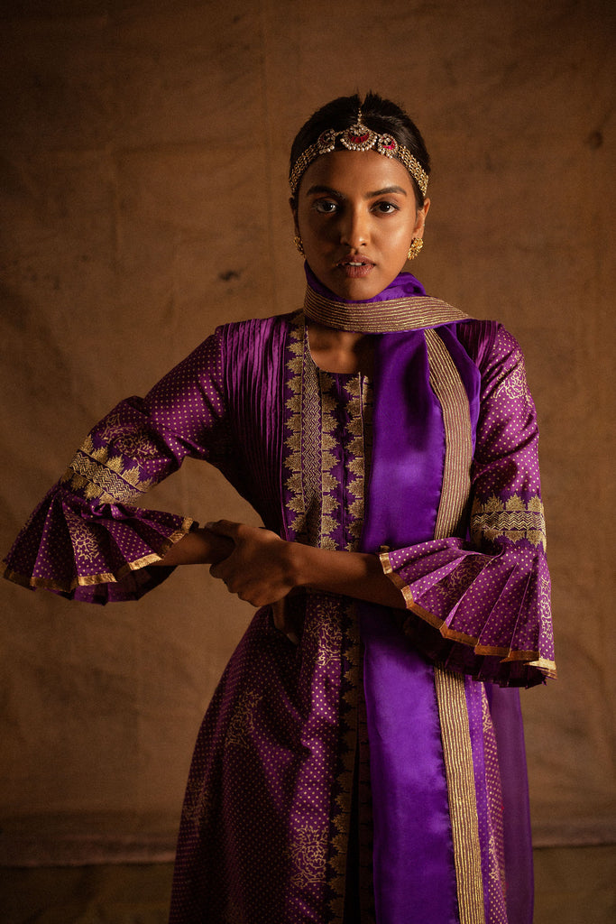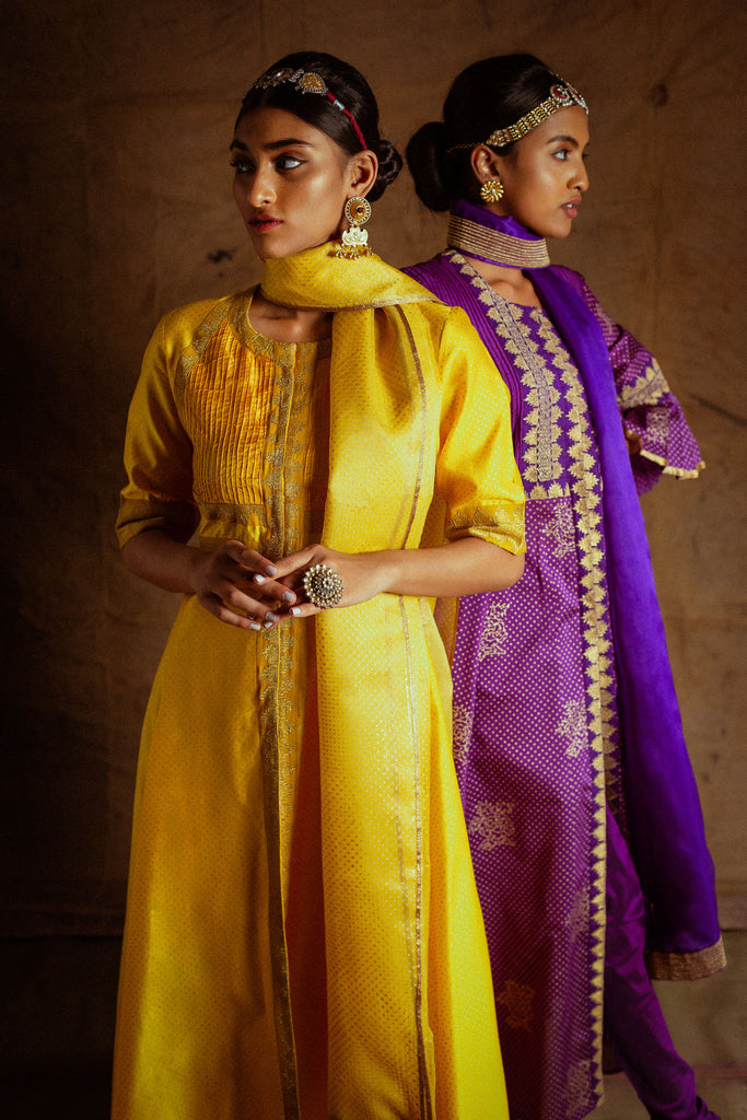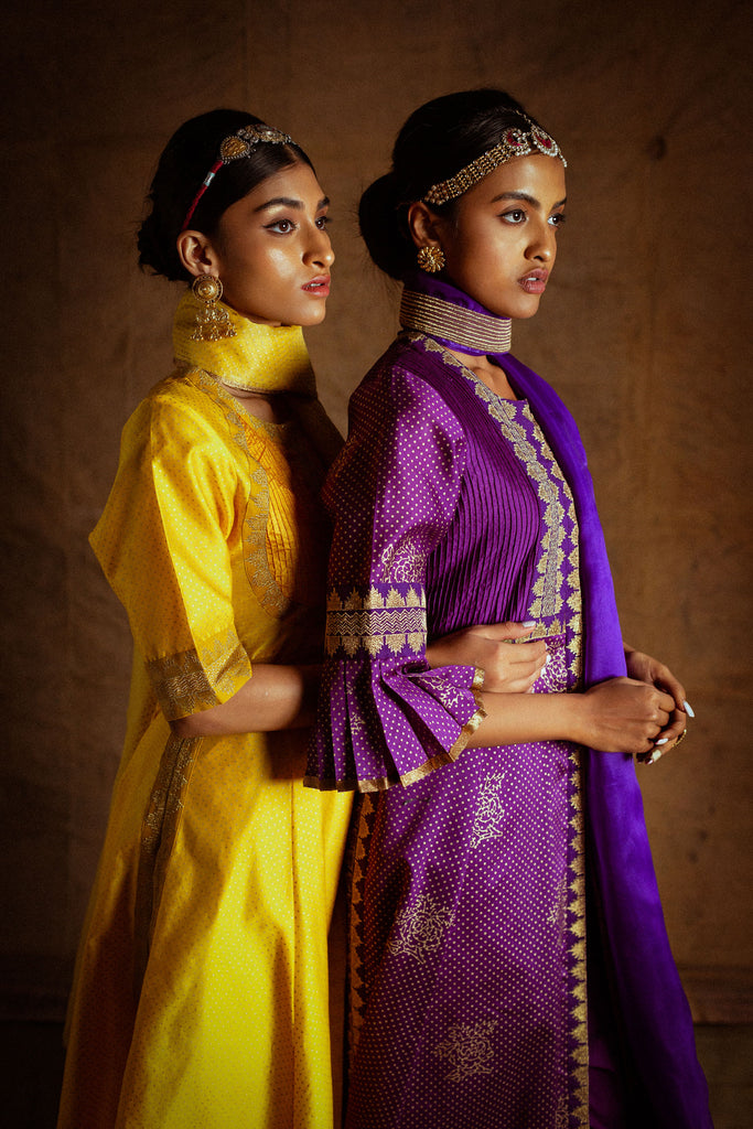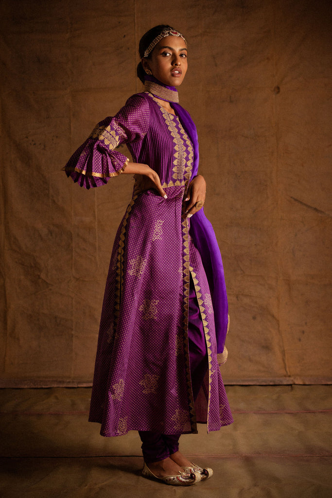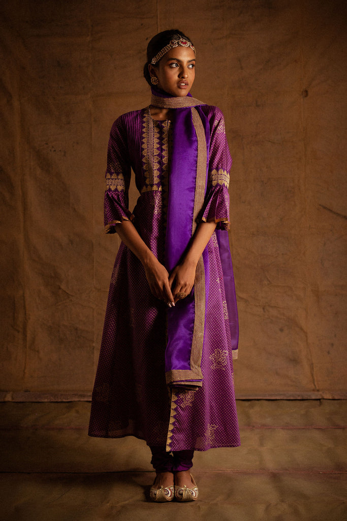 Make summer festivities all the more glamorous with this stunning purple salwar set in chanderi and silk organza. What makes this set special is the yoke, decorated with pintuck and gold kadi print and thread embroidery on the salwar. Add a silk organza dupatta with polka dot kadi , and you've got a winning ensemble!