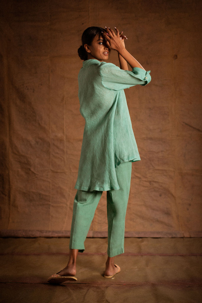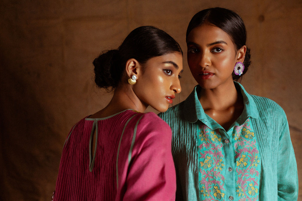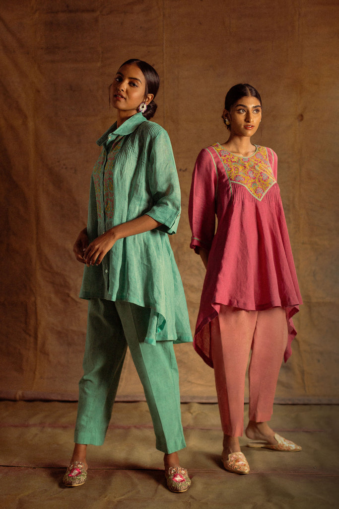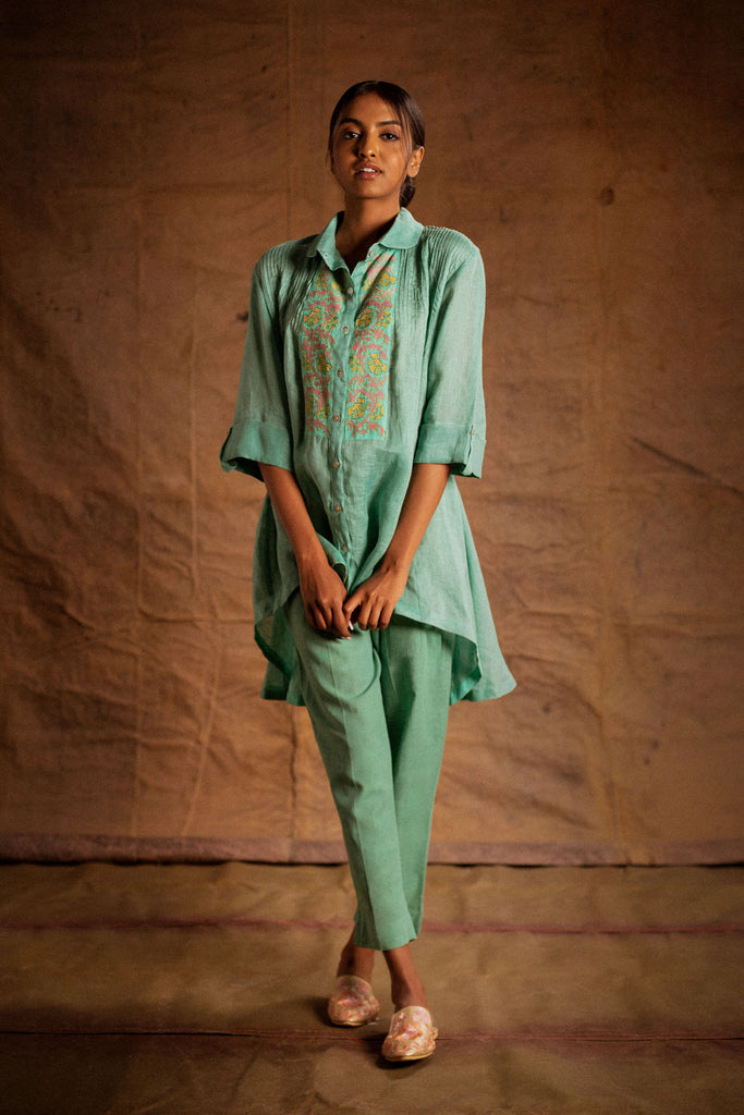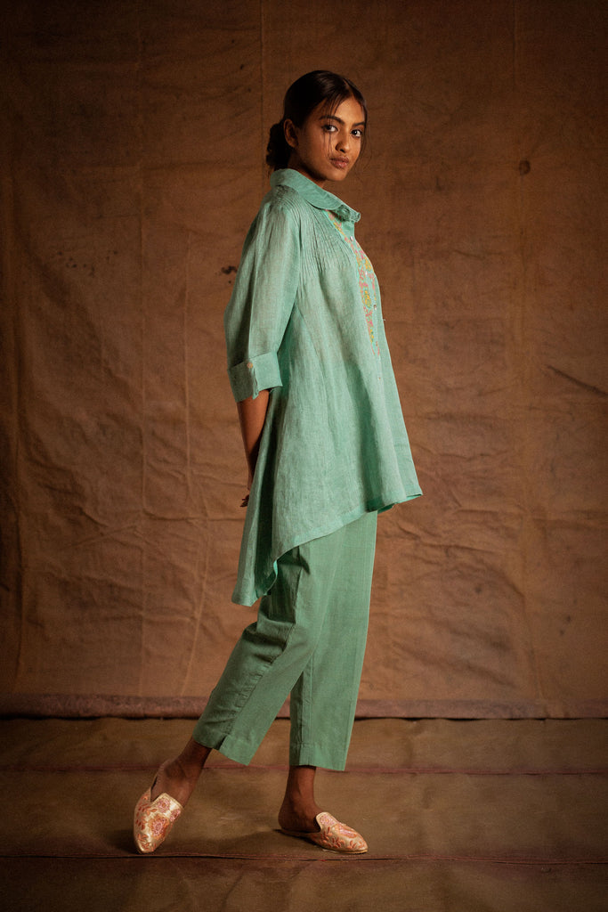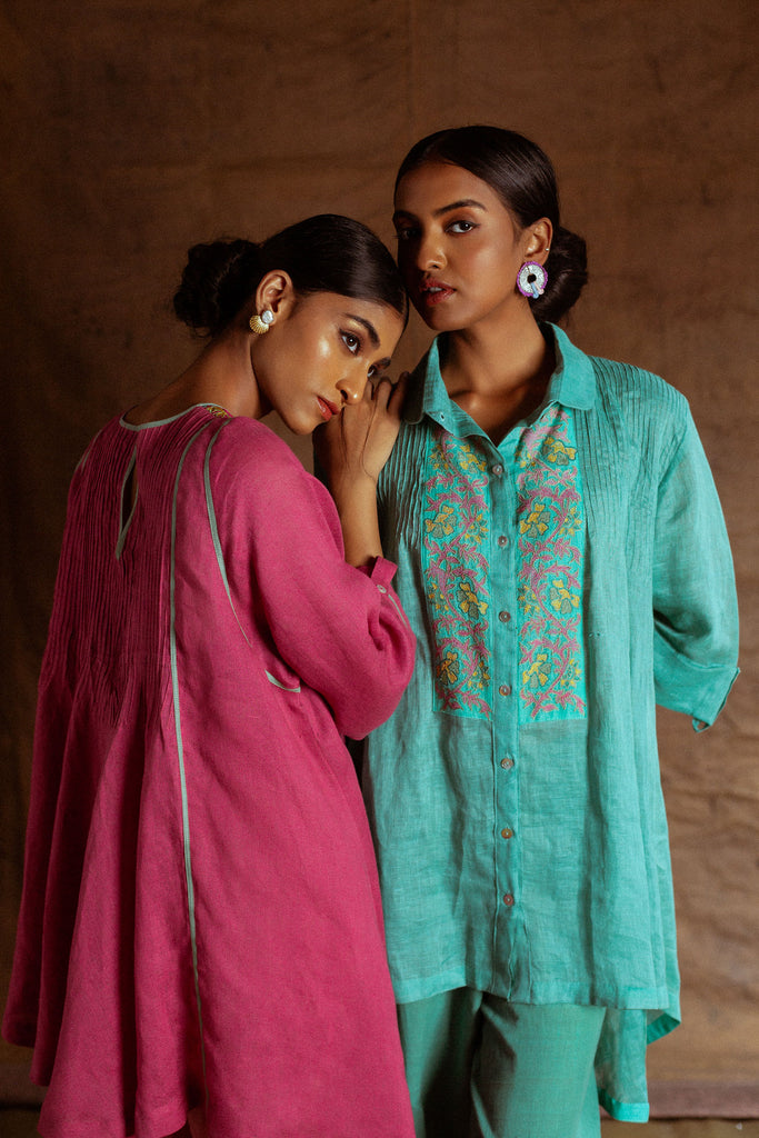 Make a bold style statement with this stunning blue tunic dress adorned with detailed thread embroidery, crafted from luxurious organic hand-woven linen.