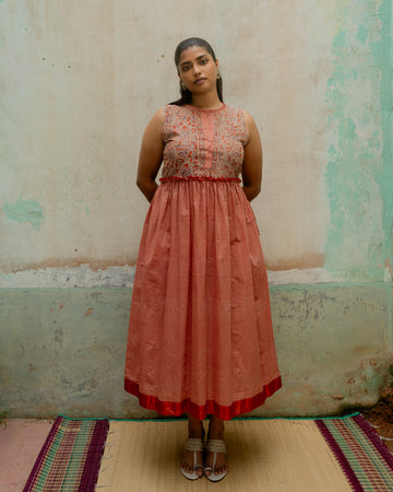 A sleeveless terracotta Anarkali dress with an intricately embroidered yoke, gathered waist and a flared skirt edged with a red zari border