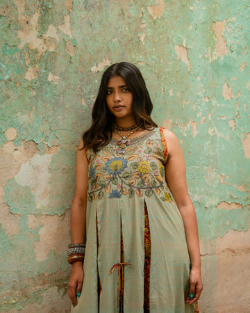 A sleeveless dress in muted sage with fine floral embroidery on the yoke. The pleated body opens into panels of hidden prints, adding depth and surprise.