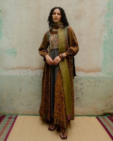 A full sleeve Mangalgiri cotton kurta with floral embroidered yoke, contrasted with warm saffron block printed handwoven panels