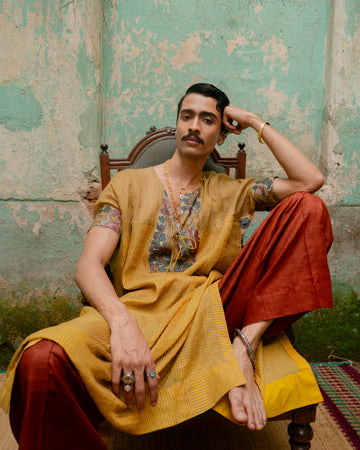 A golden yellow Benarasi Organza striped top with oversized boxy silhouette