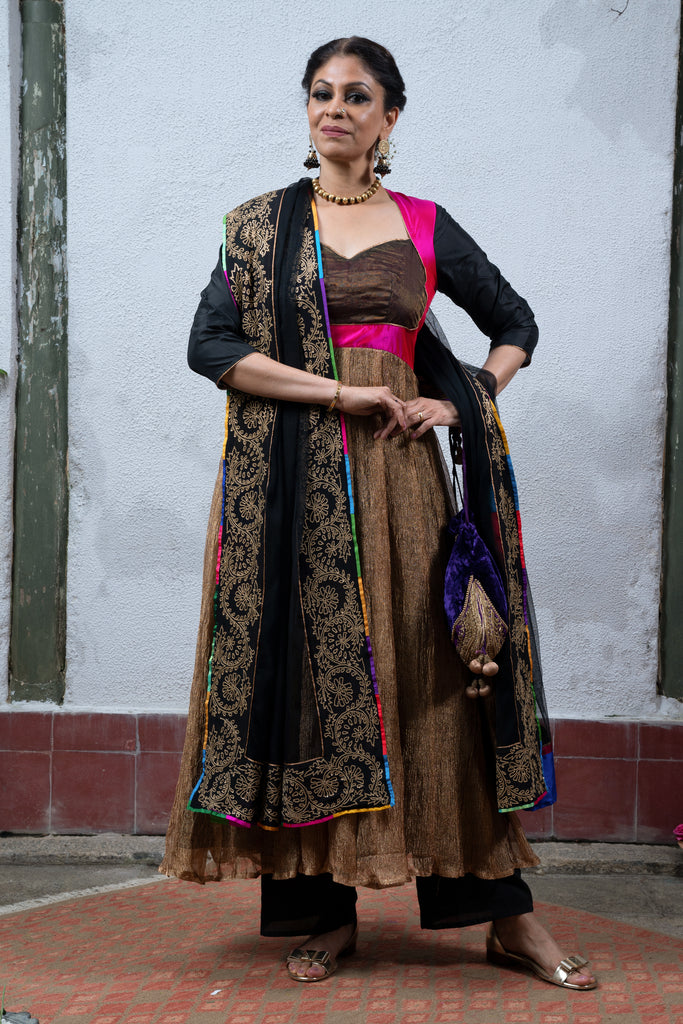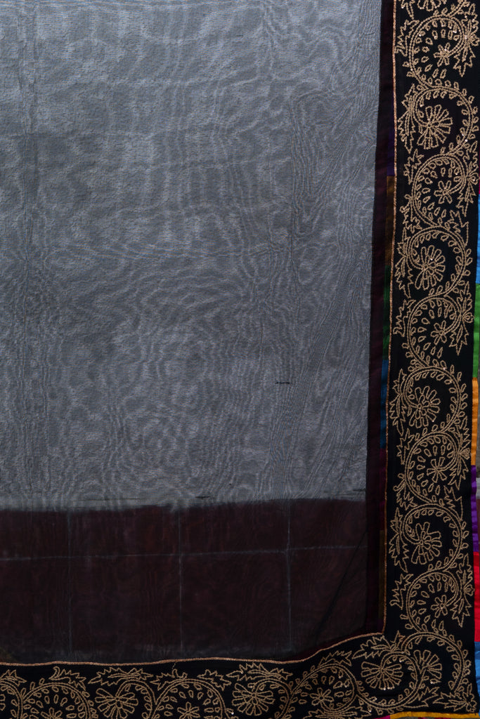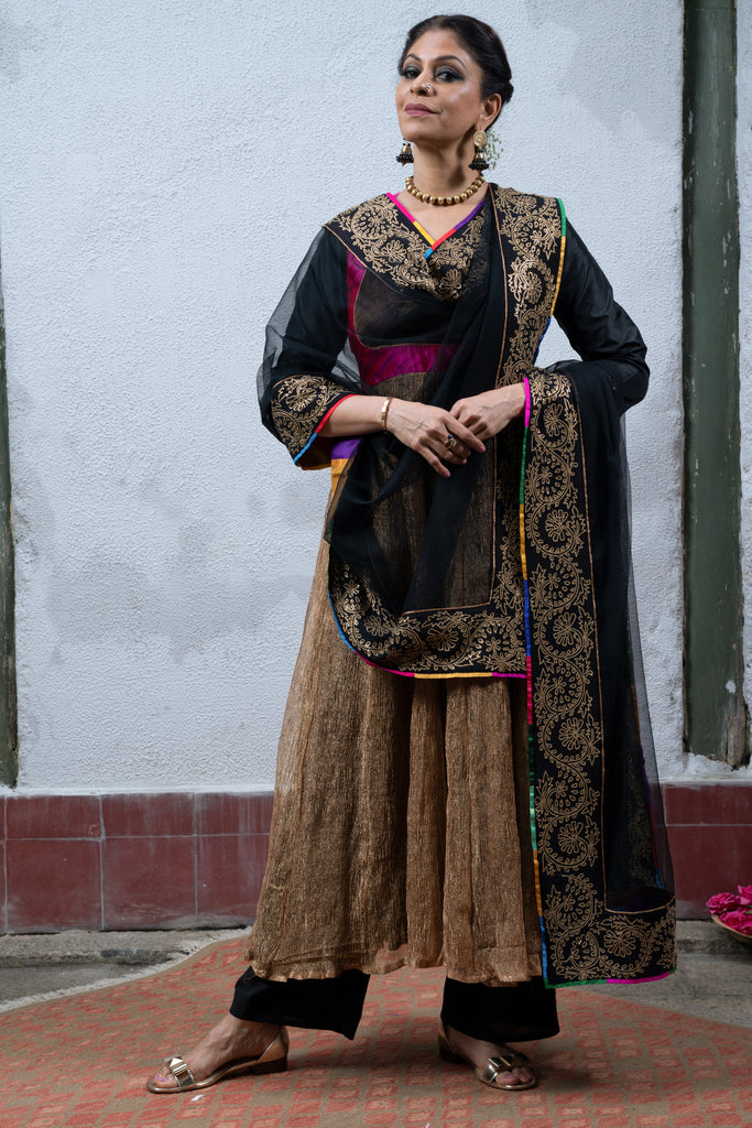 Drawing inspiration from delicate, winding creepers, this breathtaking net dupatta in black boasts stunning motifs made entirely out of sequins. It's also decorated with a multi-colored silk border in the back, making it truly versatile with outfits of any color and style!