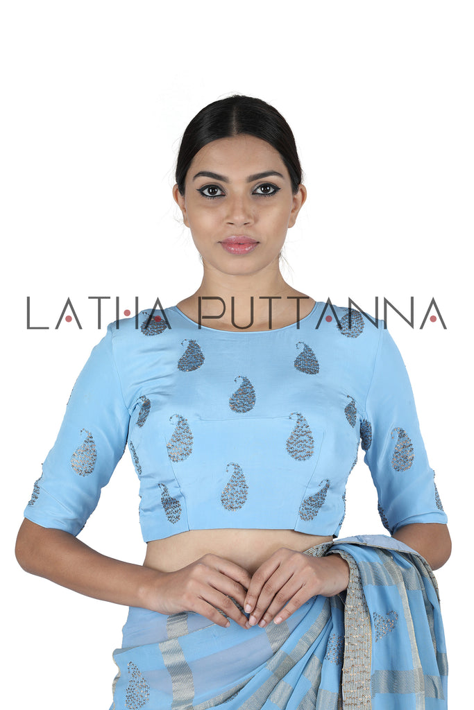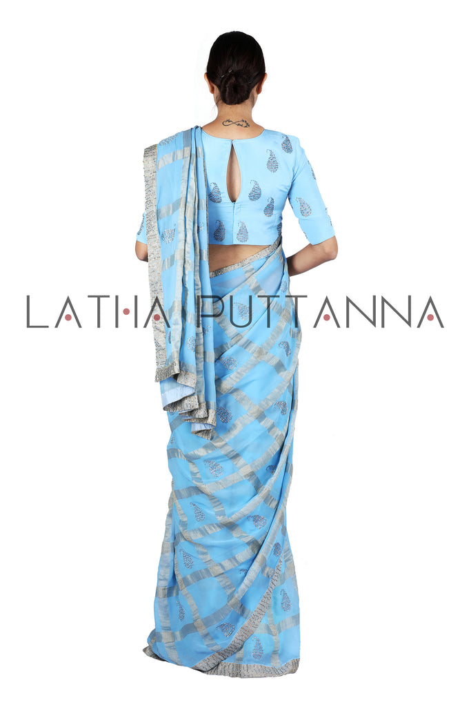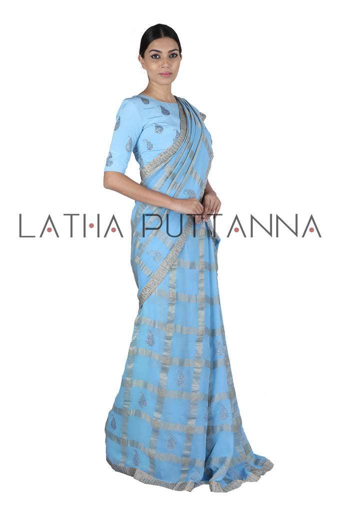A classic brought alive, Latha Puttanna creates a masterpiece with this rendition. A beautiful Blue georgette saree is made stunning with striking broad gold checks and hand-embroidered paisleys. The blue background elevates the thread embroidery and sequence on tissue border.The saree has been paired with a blue crepe blouse that sports matching embroidery.